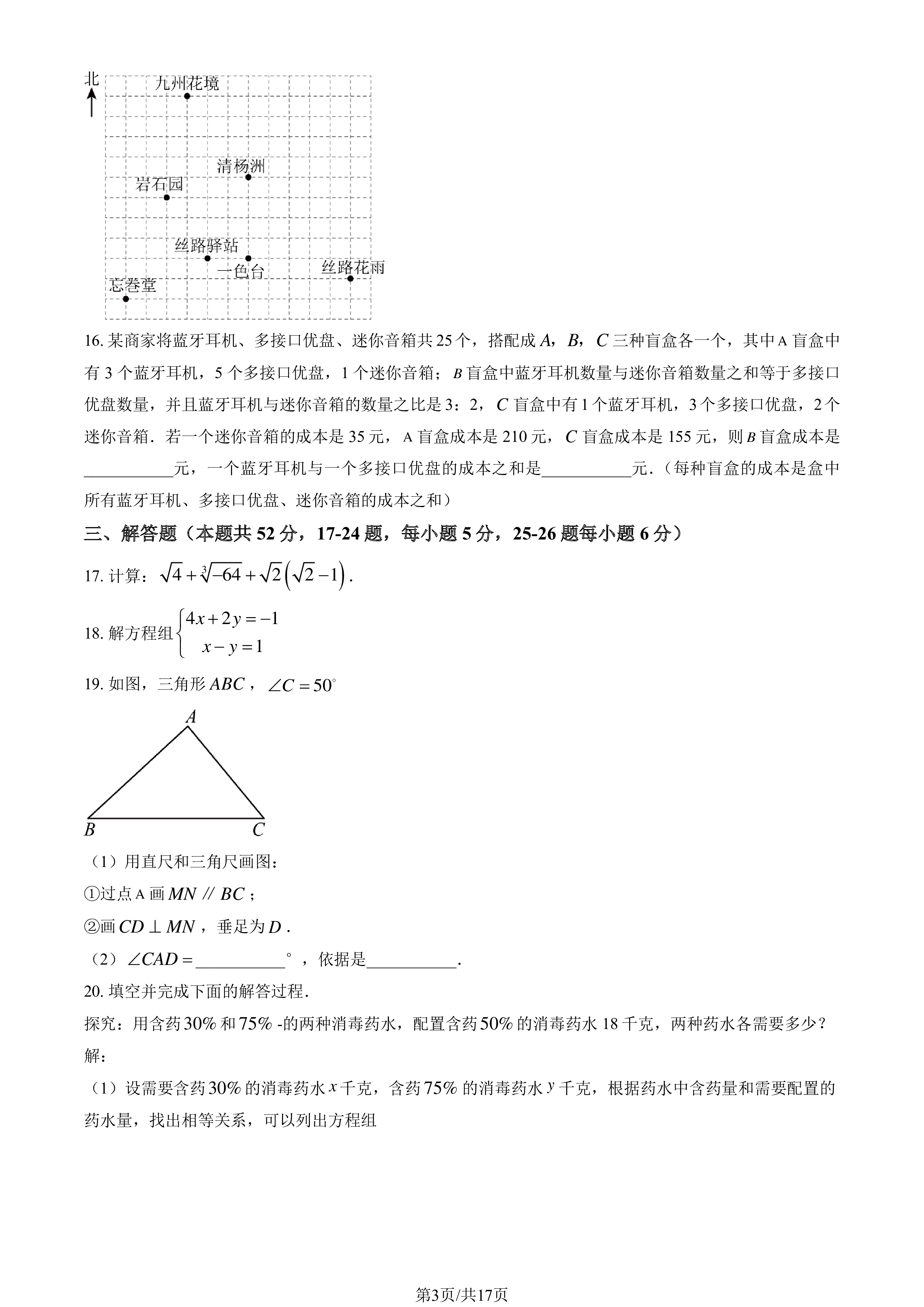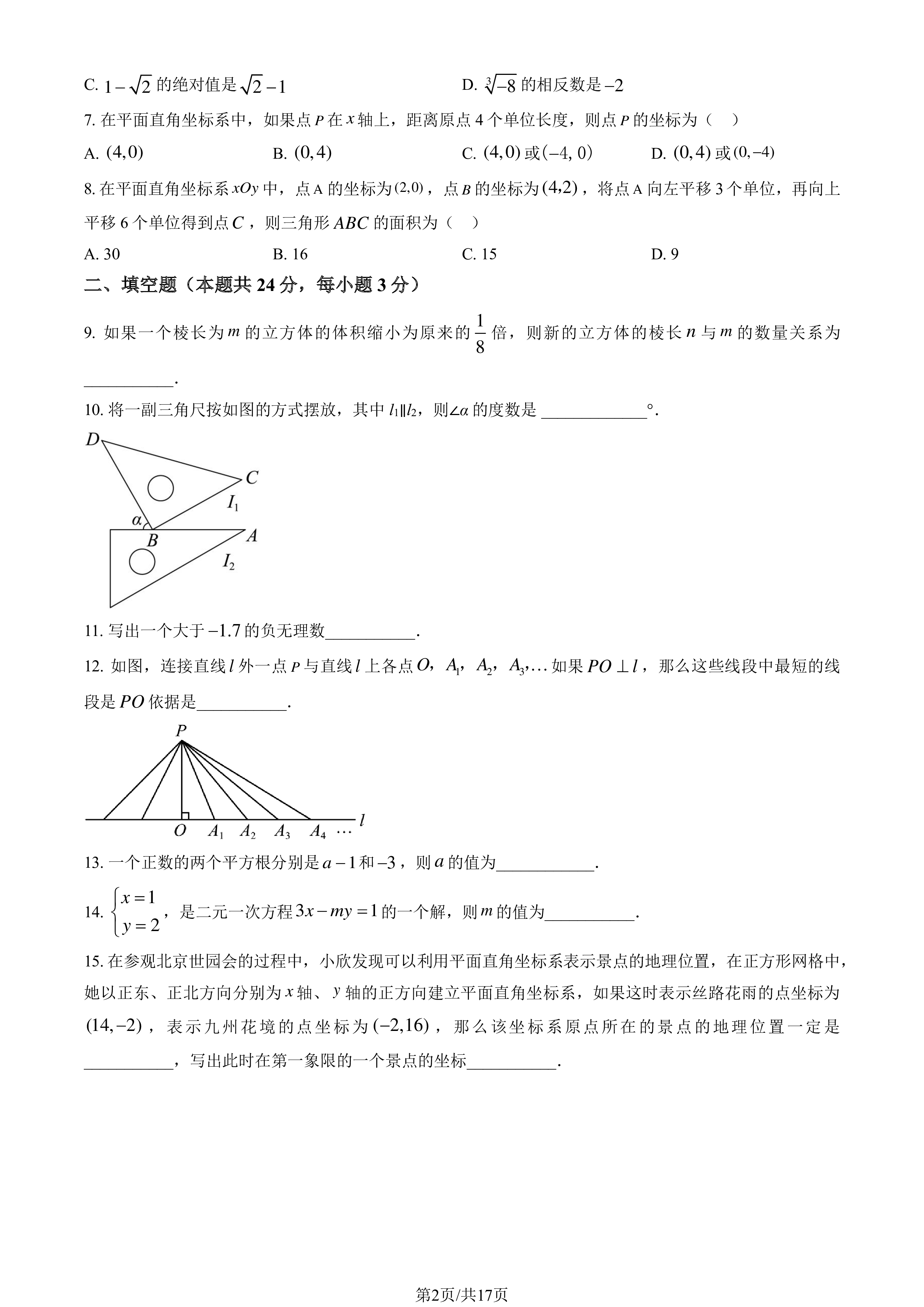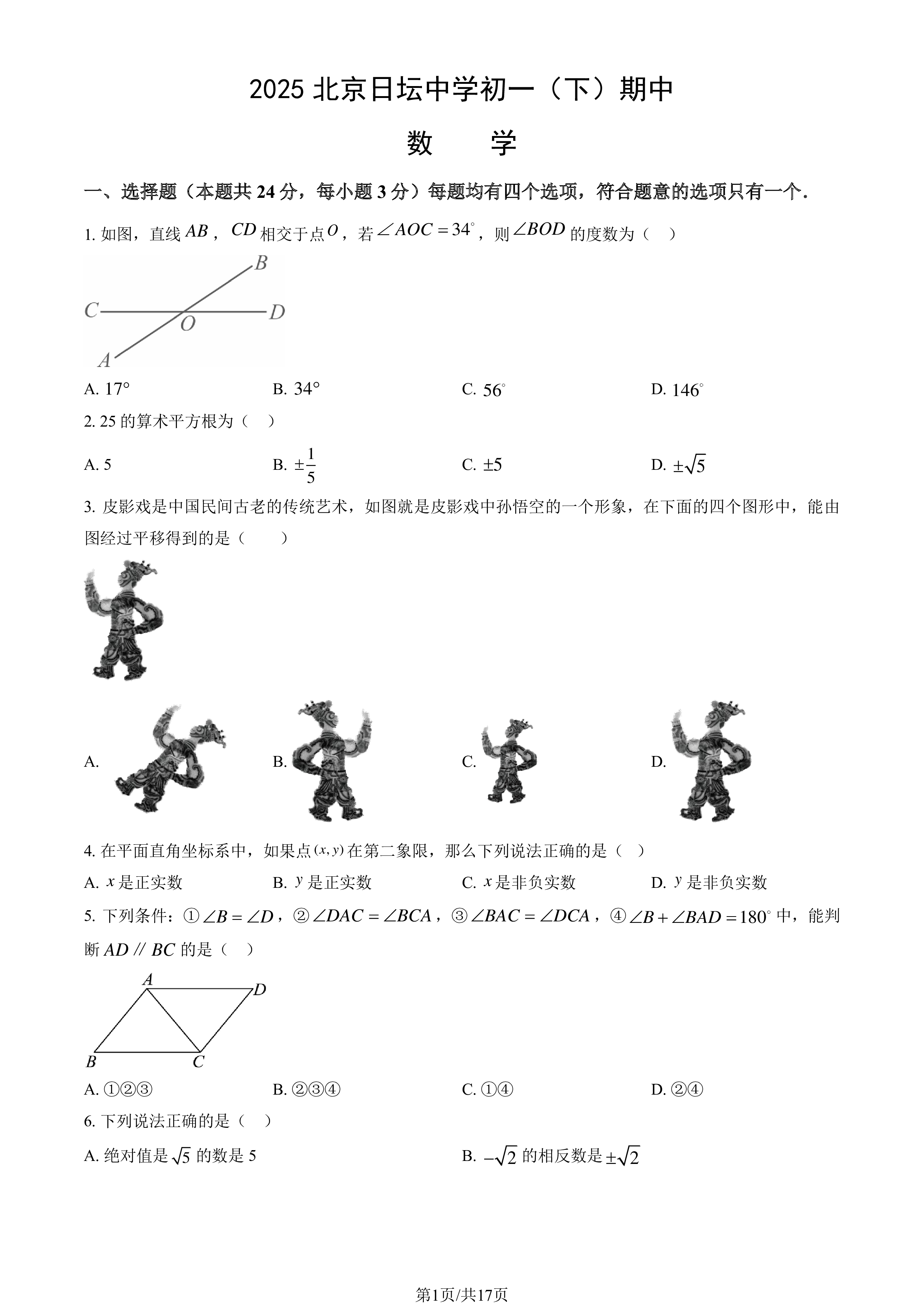 第1页/共17页2025北京日坛中学初一(下)期中数学一、选择题(本题共24分,每小题3分)每题均有四个选项,符合题意的选项只有一个.1.如图,直线,相交于点,若,则的度数为()A.B.C.D.2.25的算术平方根为()A.5B.C.D.3.皮影戏是中国民间古老的传统艺术,如图就是皮影戏中孙悟空的一个形象,在下面的四个图形中,能由图经过平移得到的是()A.B.C.D.4.在平面直角坐标系中,如果点在第二象限,那么下列说法正确的是()A.是正实数B.是正实数C.是非负实数D.是非负实数5.下列条件:①,②,③,④中,能判断的是()A.①②③B.②③④C.①④D.②④6.下列说法正确的是()A.绝...