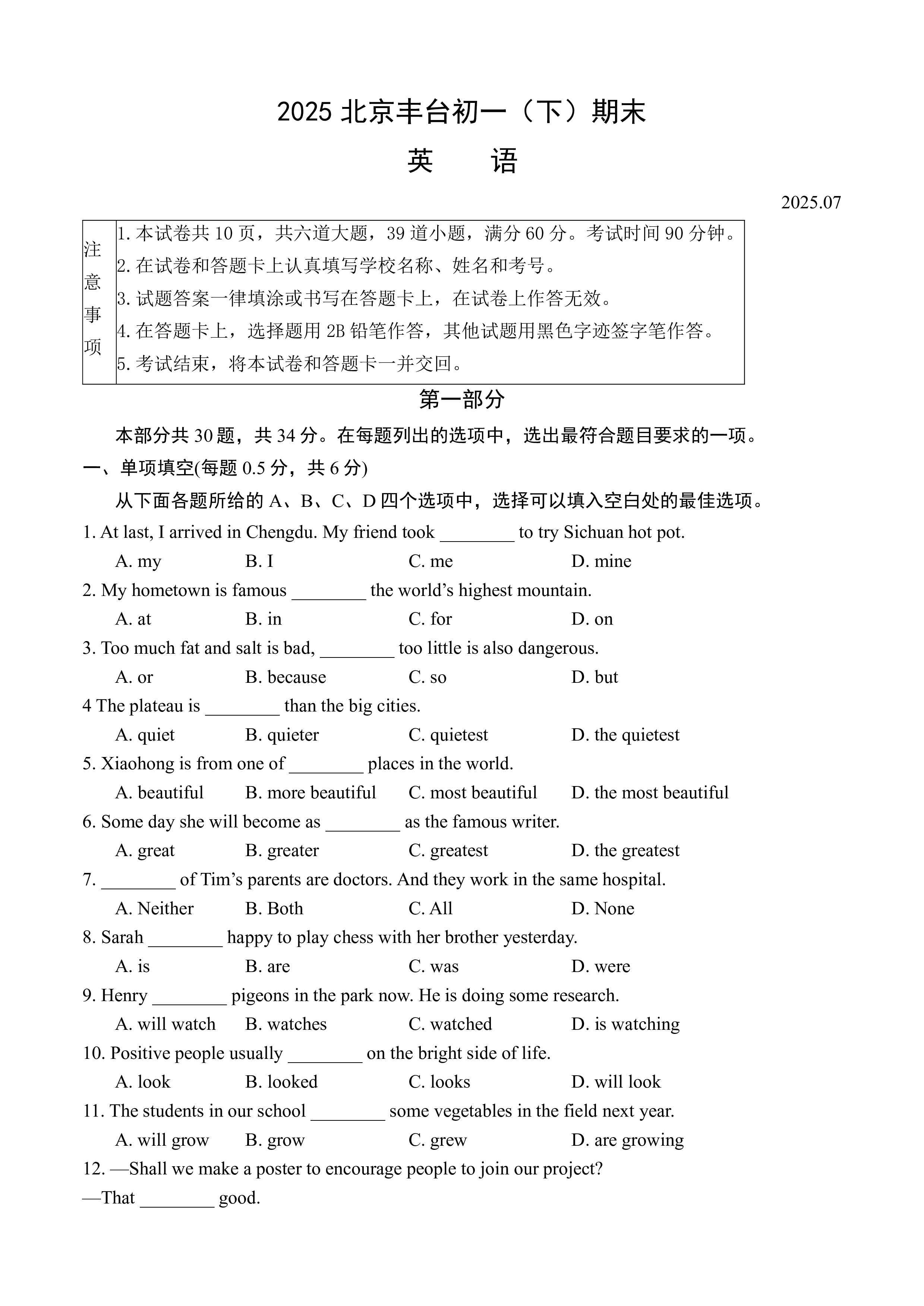 2025北京丰台初一(下)期末英语2025.07注意事项1.本试卷共10页,共六道大题,39道小题,满分60分。考试时间90分钟。2.在试卷和答题卡上认真填写学校名称、姓名和考号。3.试题答案一律填涂或书写在答题卡上,在试卷上作答无效。4.在答题卡上,选择题用2B铅笔作答,其他试题用黑色字迹签字笔作答。5.考试结束,将本试卷和答题卡一并交回。第一部分本部分共30题,共34分。在每题列出的选项中,选出最符合题目要求的一项。一、单项填空(每题0.5分,共6分)从下面各题所给的A、B、C、D四个选项中,选择可以填入空白处的最佳选项。1.Atlast,IarrivedinChengdu.Myfrien...