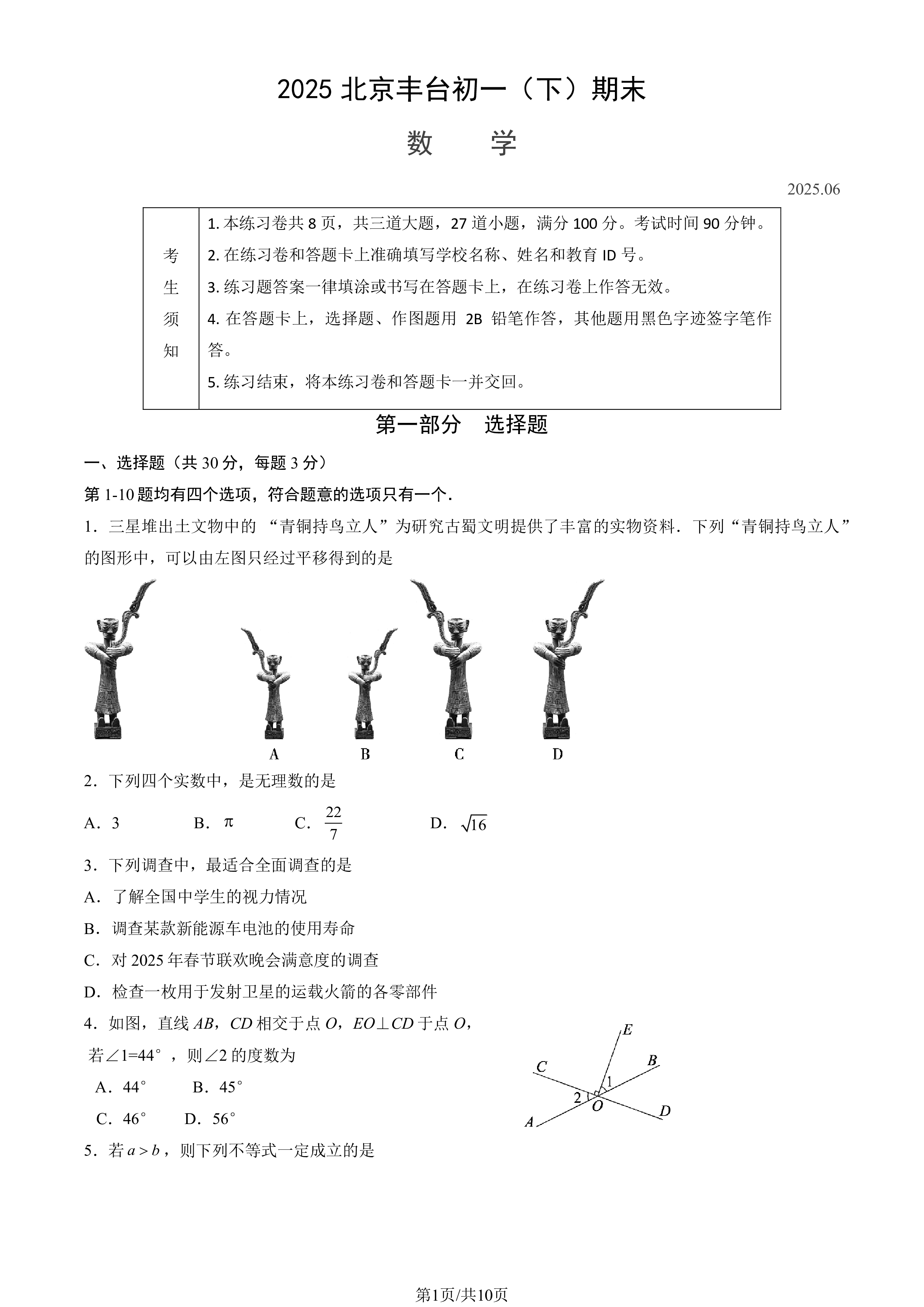 第1页/共10页2025北京丰台初一(下)期末数学2025.06考生须知1.本练习卷共8页,共三道大题,27道小题,满分100分。考试时间90分钟。2.在练习卷和答题卡上准确填写学校名称、姓名和教育ID号。3.练习题答案一律填涂或书写在答题卡上,在练习卷上作答无效。4.在答题卡上,选择题、作图题用2B铅笔作答,其他题用黑色字迹签字笔作答。5.练习结束,将本练习卷和答题卡一并交回。第一部分选择题一、选择题(共30分,每题3分)第1-10题均有四个选项,符合题意的选项只有一个.1.三星堆出土文物中的“青铜持鸟立人”为研究古蜀文明提供了丰富的实物资料.下列“青铜持鸟立人”的图形中,可以由左图只经过平...