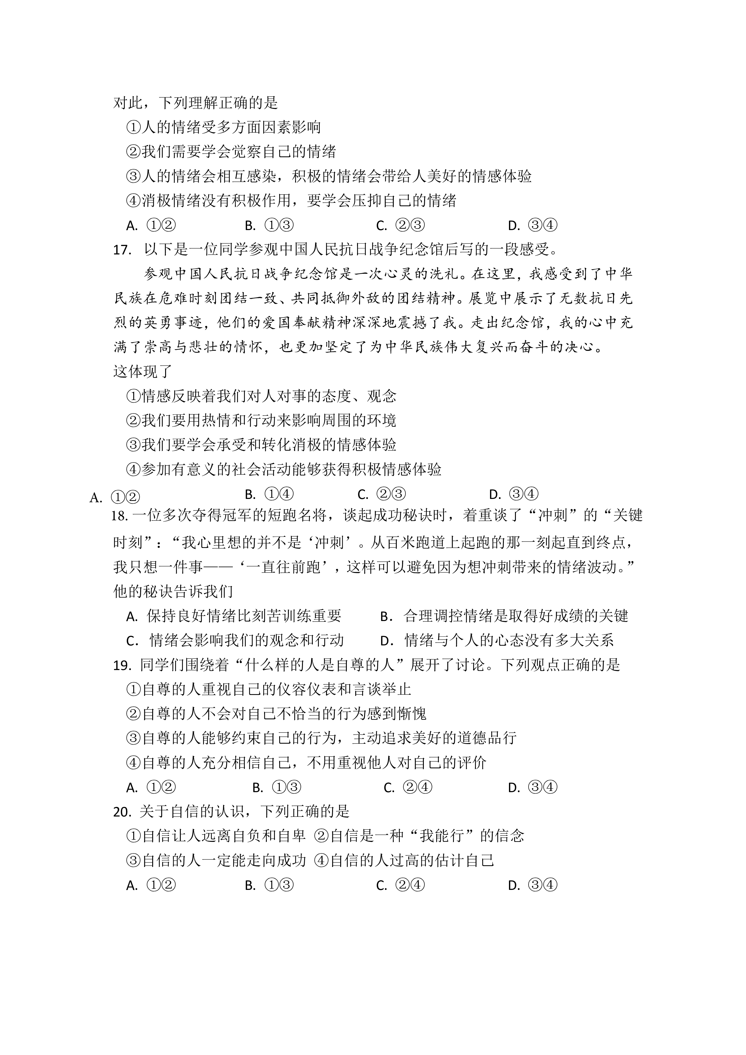 北师大实验中学2024-2025学年度第二学期期中试卷初一年级道德与法治班级姓名学号成绩考生须知1.本试卷共8页,共3道大题,33道小题;答题纸共1页。满分100分。考试时间60分钟。2.在试卷和答题卡上准确填写班级、姓名、学号。3.试卷答案一律填写在答题卡上,在试卷上作答无效。4.在答题卡上,选择题须用2B铅笔将选中项涂黑涂满,其他试题用黑色字迹签字笔作答。命题人:吕依凡审题人:冯琳一、判断题(本题共10小题,每小题2分,共20分。)1.青春期是人身体发育的重要时期,我们的身体发育有着同样的韵律和节拍。2.与异性交往既要热情大方,又要掌握分寸,做到言谈得当、举止得体。3.人的情绪受多方面因素...