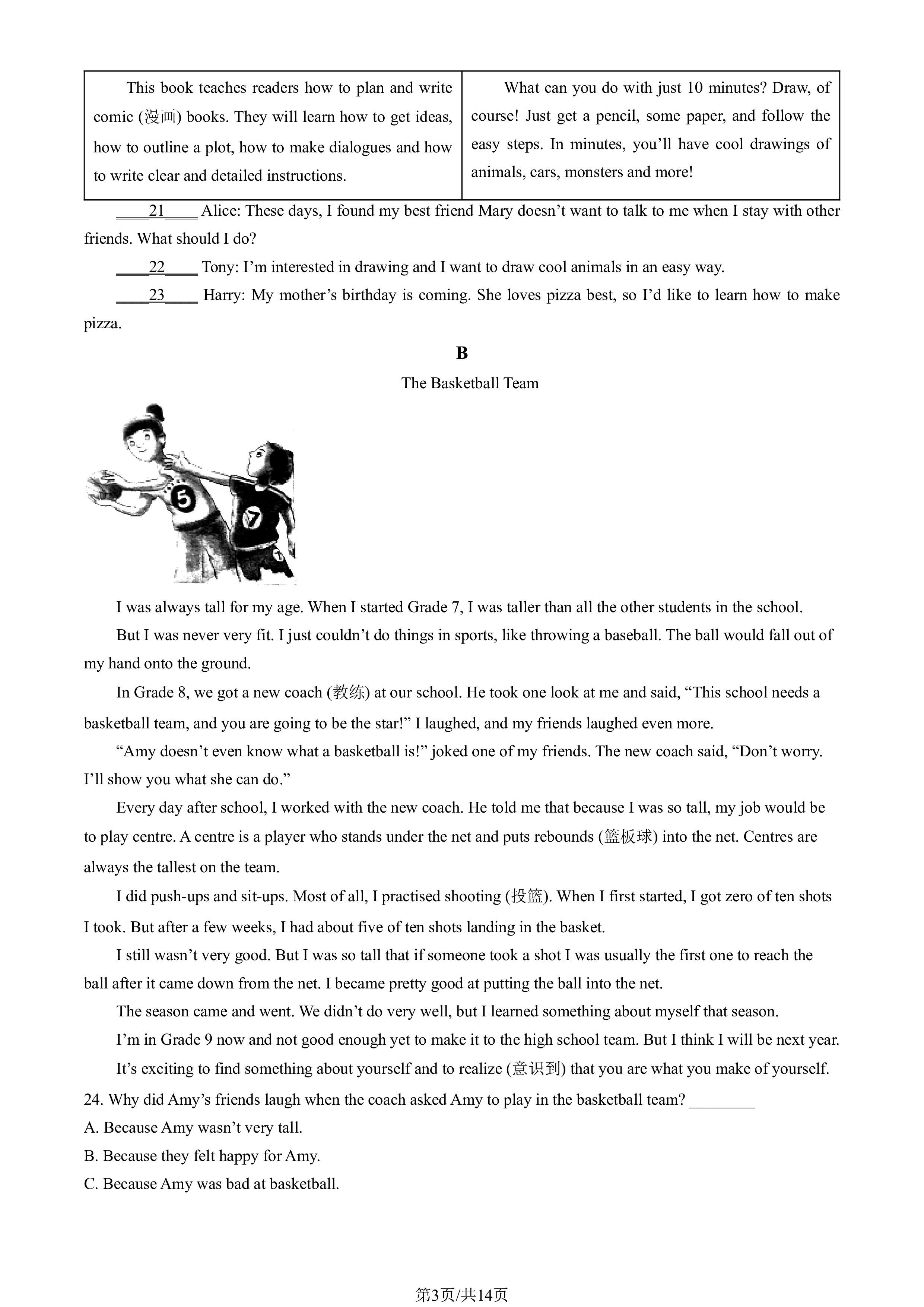 第1页/共14页2025北京广渠门中学初一(下)期中英语时间:90分钟2025.4本试卷共5页,60分。考试时长90分钟。考生务必将答案答在答题纸上,在试卷上作答无.......效.。一、单项填空。(每题0.5分,共6分)从下面各题所给的A、B、C、D四个选项中,选择可以填入空白处的最佳选项。1.—Isthisyourwallet,Lora?—No,it’snot.Ithinkit’sAmy’s.A.hersB.yoursC.hisD.mine2.—Betty,whattimeisyourartlesson?—Ihaveart________twentypasttenonWednesday.A...