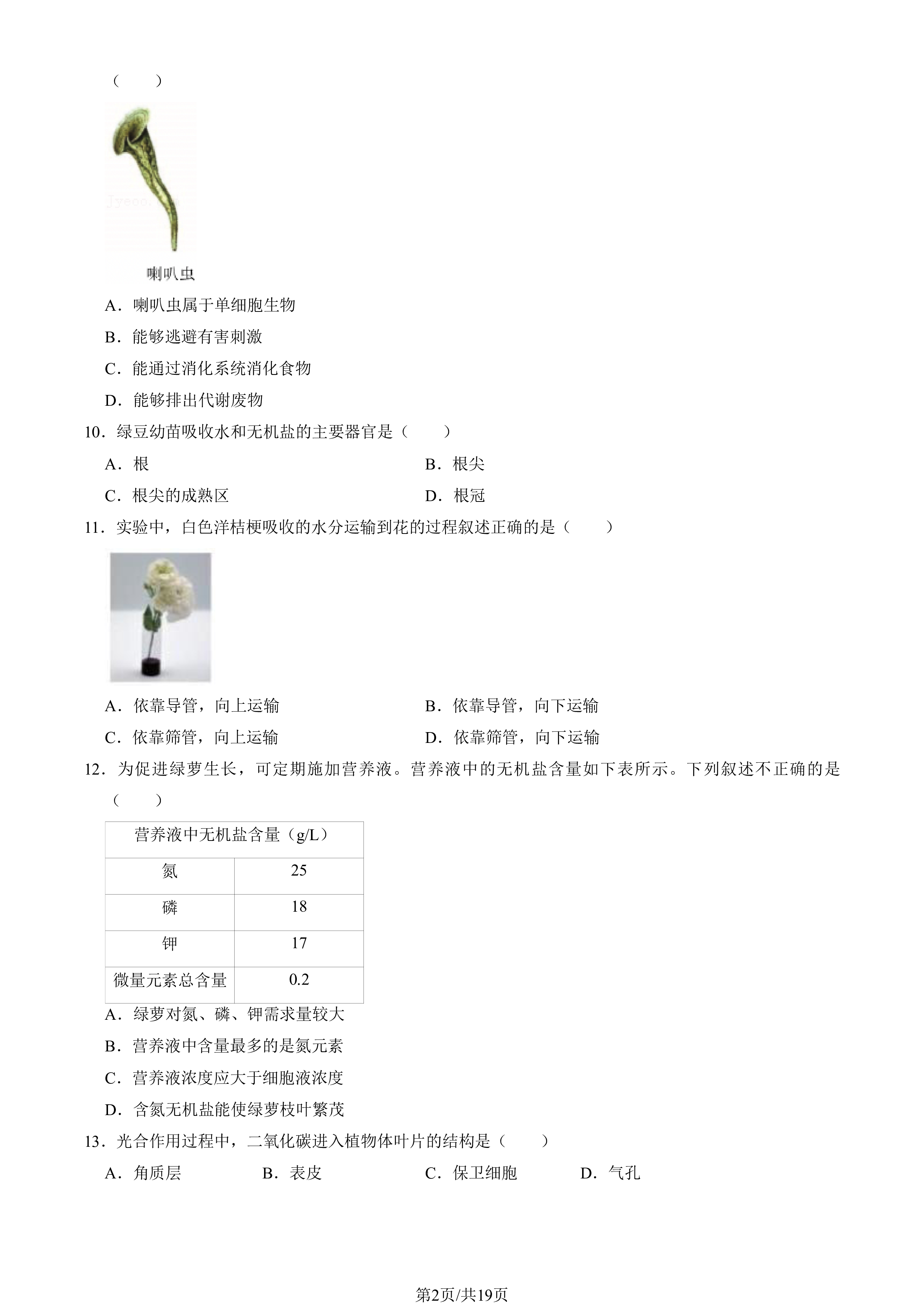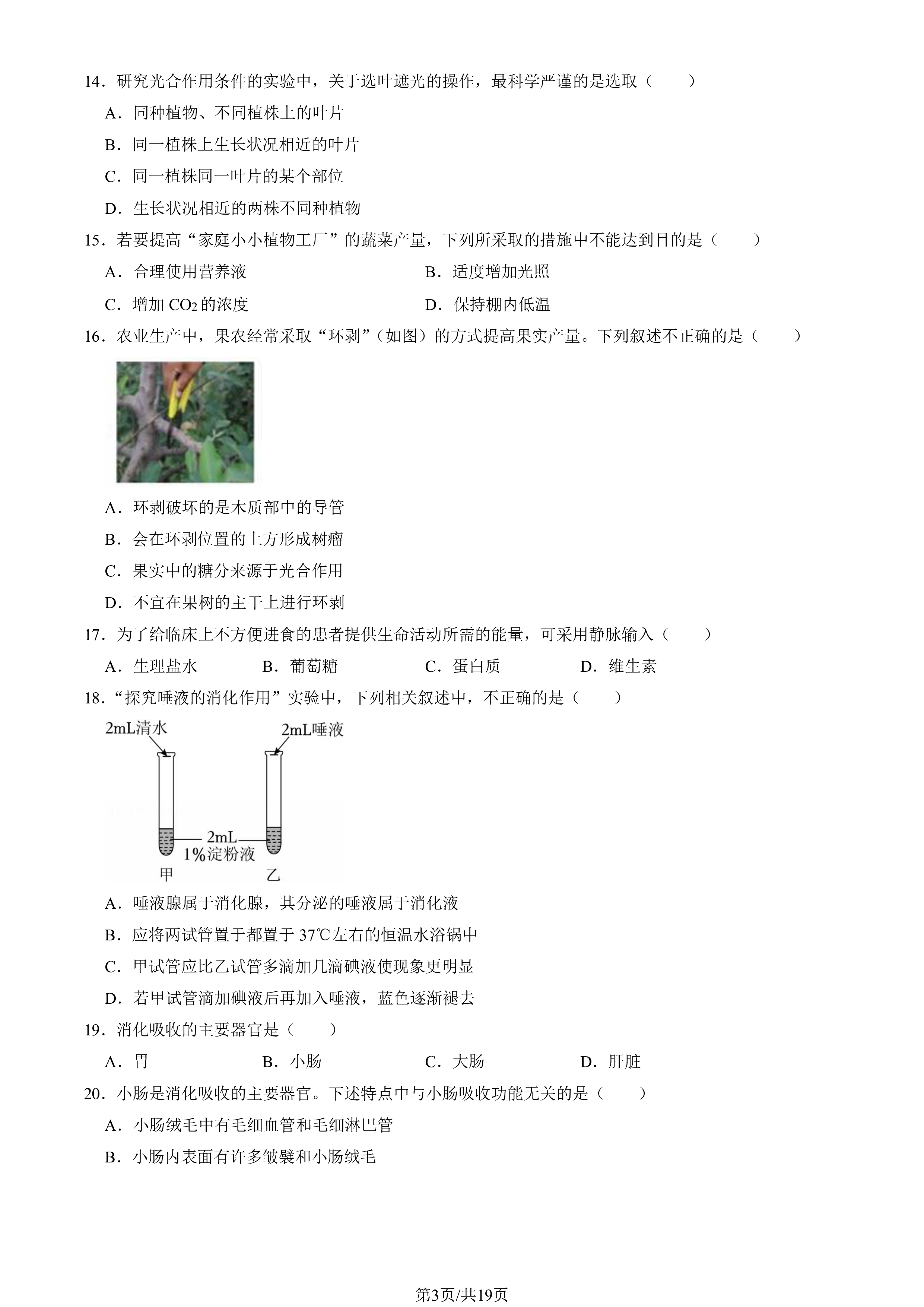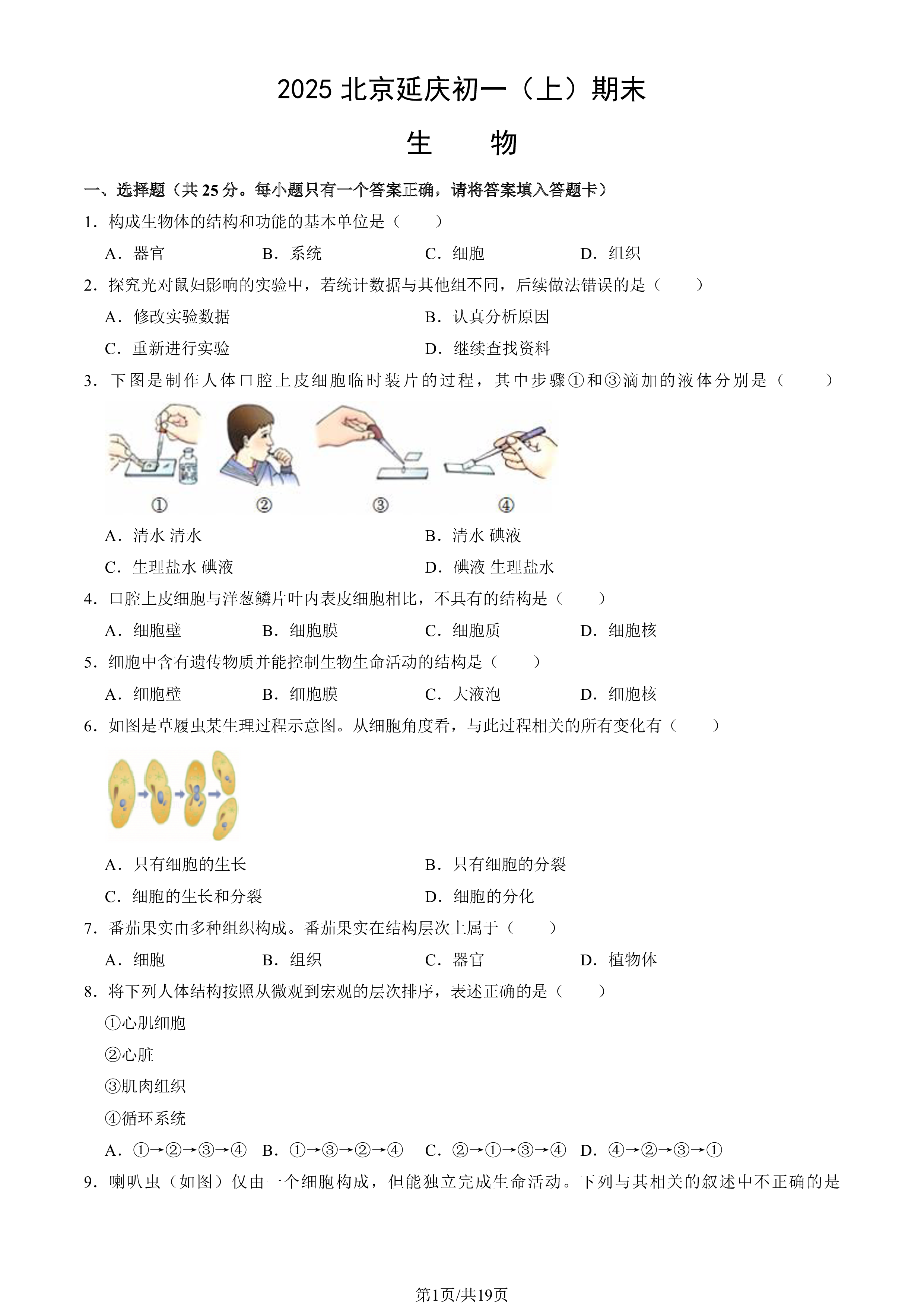 第1页/共19页2025北京延庆初一(上)期末生物一、选择题(共25分。每小题只有一个答案正确,请将答案填入答题卡)1.构成生物体的结构和功能的基本单位是()A.器官B.系统C.细胞D.组织2.探究光对鼠妇影响的实验中,若统计数据与其他组不同,后续做法错误的是()A.修改实验数据B.认真分析原因C.重新进行实验D.继续查找资料3.下图是制作人体口腔上皮细胞临时装片的过程,其中步骤①和③滴加的液体分别是()A.清水清水B.清水碘液C.生理盐水碘液D.碘液生理盐水4.口腔上皮细胞与洋葱鳞片叶内表皮细胞相比,不具有的结构是()A.细胞壁B.细胞膜C.细胞质D.细胞核5.细胞中含有遗传物质并能控制生物...
