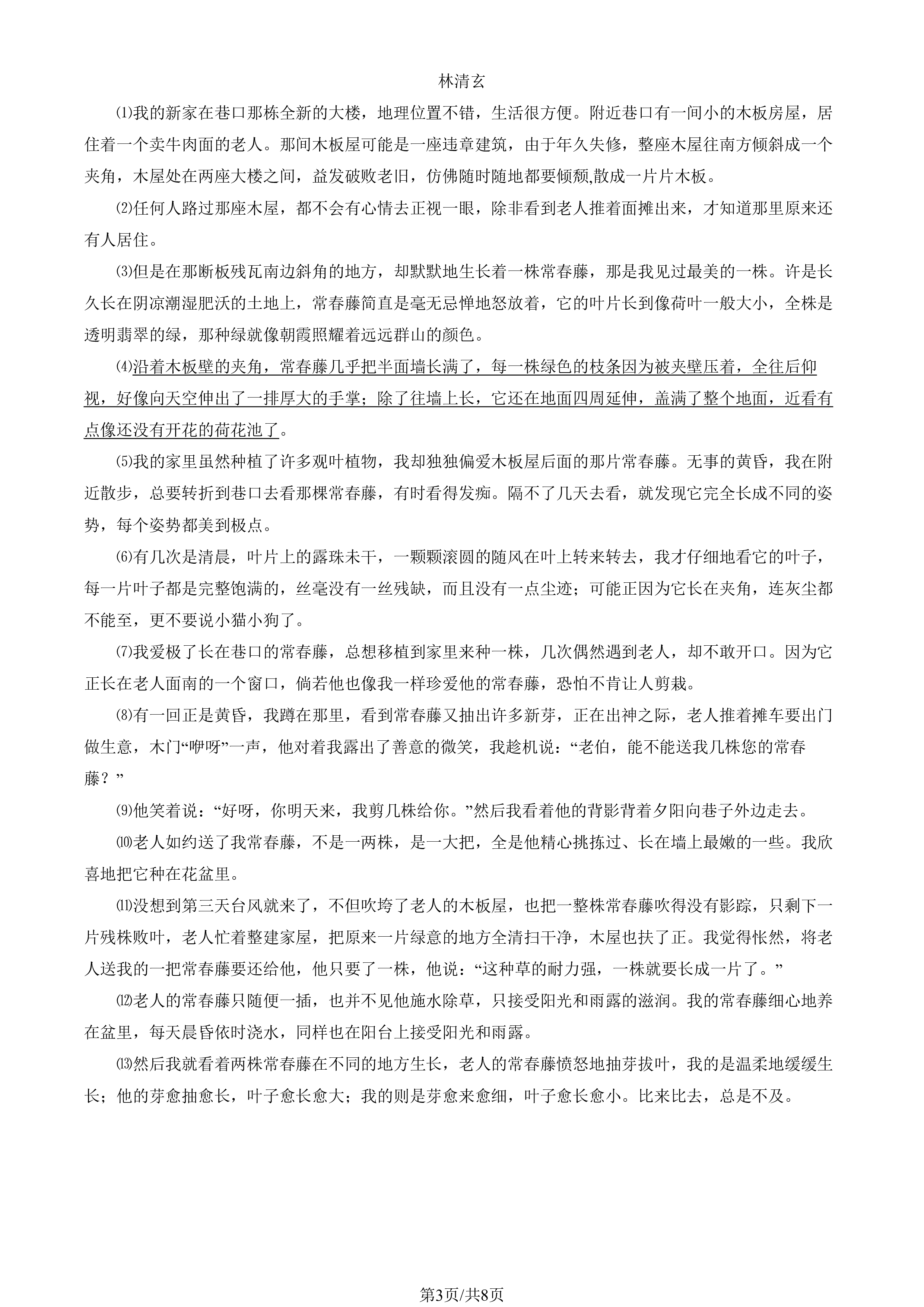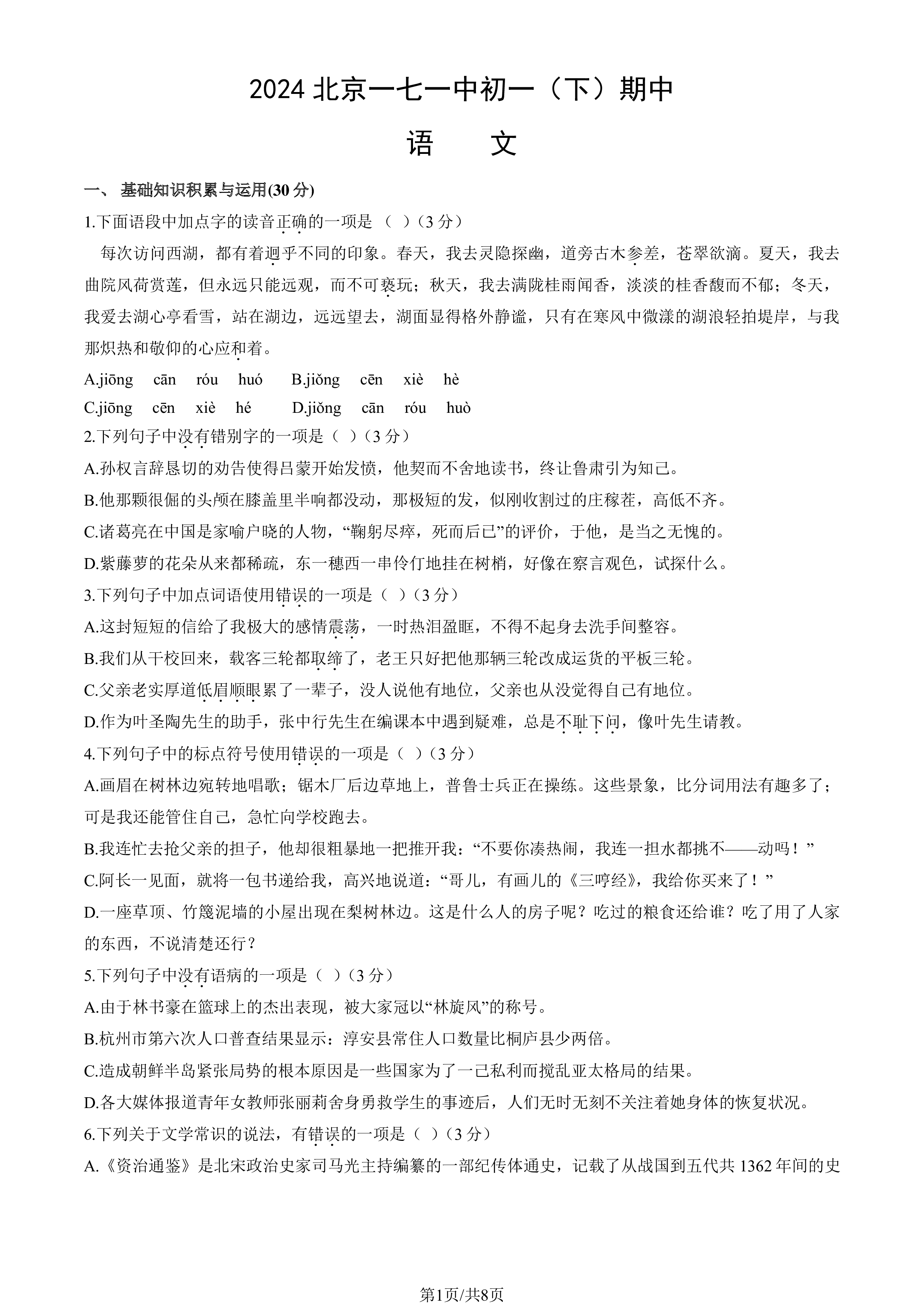第1页/共8页2024北京一七一中初一(下)期中语文一、基础知识积累与运用(30分)1.下面语段中加点字的读音正确..的一项是()(3分)每次访问西湖,都有着迥.乎不同的印象。春天,我去灵隐探幽,道旁古木参.差,苍翠欲滴。夏天,我去曲院风荷赏莲,但永远只能远观,而不可亵.玩;秋天,我去满陇桂雨闻香,淡淡的桂香馥而不郁;冬天,我爱去湖心亭看雪,站在湖边,远远望去,湖面显得格外静谧,只有在寒风中微漾的湖浪轻拍堤岸,与我那炽热和敬仰的心应和.着。A.jiōngcānróuhuóB.jiǒngcēnxièhèC.jiōngcēnxièhéD.jiǒngcānróuhuò2.下列句子中没有..错别字的一...