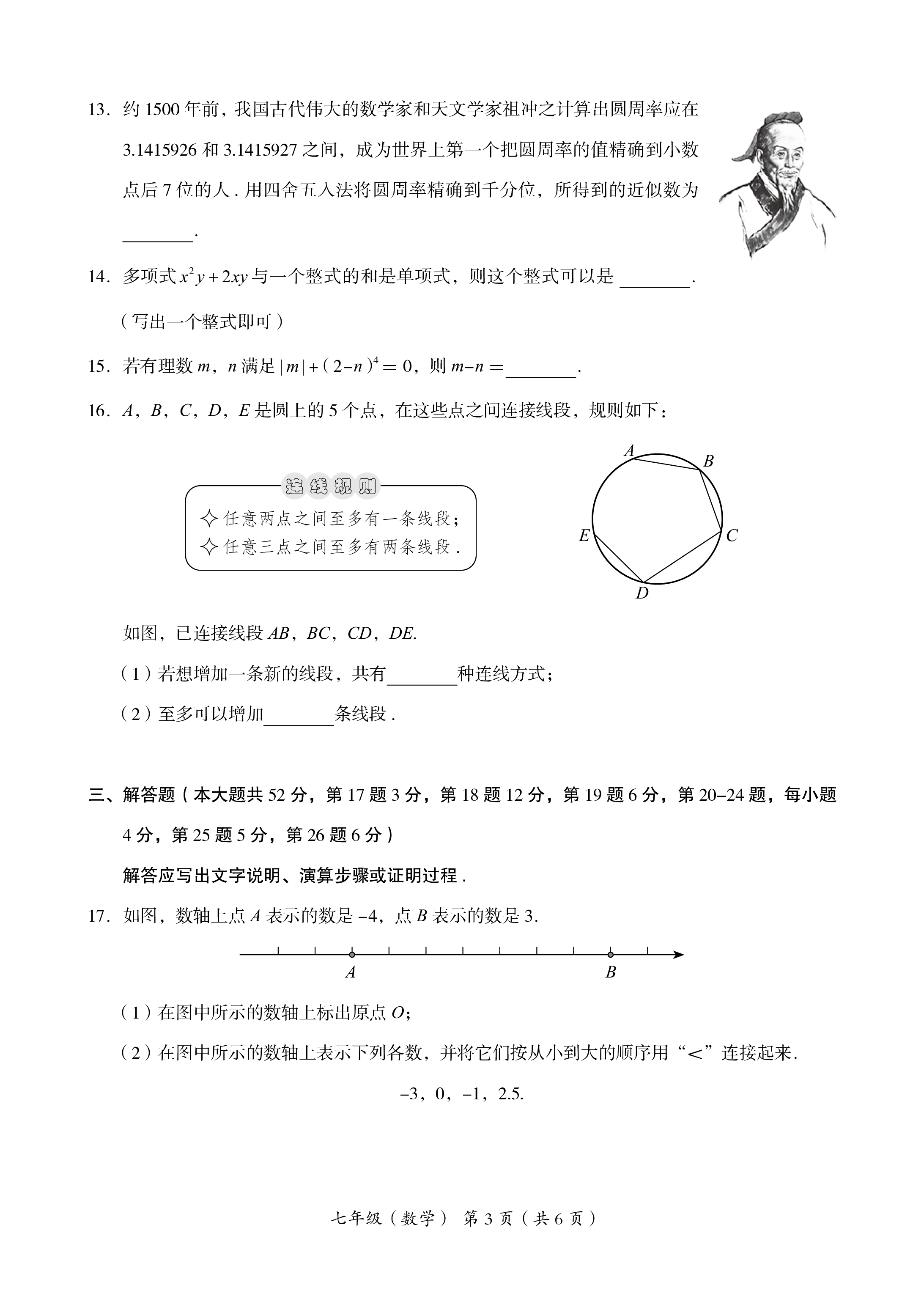 七年级(数学) 第1页(共6页)海淀区2024年七年级增值评价基线调研数 学注意事项1.本调研卷共6页,共3道大题,26道小题。满分100分。调研时间90分钟。2.在答题纸上准确填写姓名、学校名称和准考证号,并将条形码贴在指定区域。3.答案一律填涂或书写在答题纸上,在调研卷上作答无效。4.在答题纸上,选择题用2B铅笔作答,其他题目用黑色字迹的签字笔作答。5.调研结束,请将答题纸交回。一、选择题(本题共30分,每小题3分)1.−12的相反数是A.12B.−12C.2D.-22.稀土是钪、钇、镧系17种元素的总称,素有“工业味精”之美誉,是我国重要的战略矿产资源.2024年我国稀土勘探在四川凉山取...