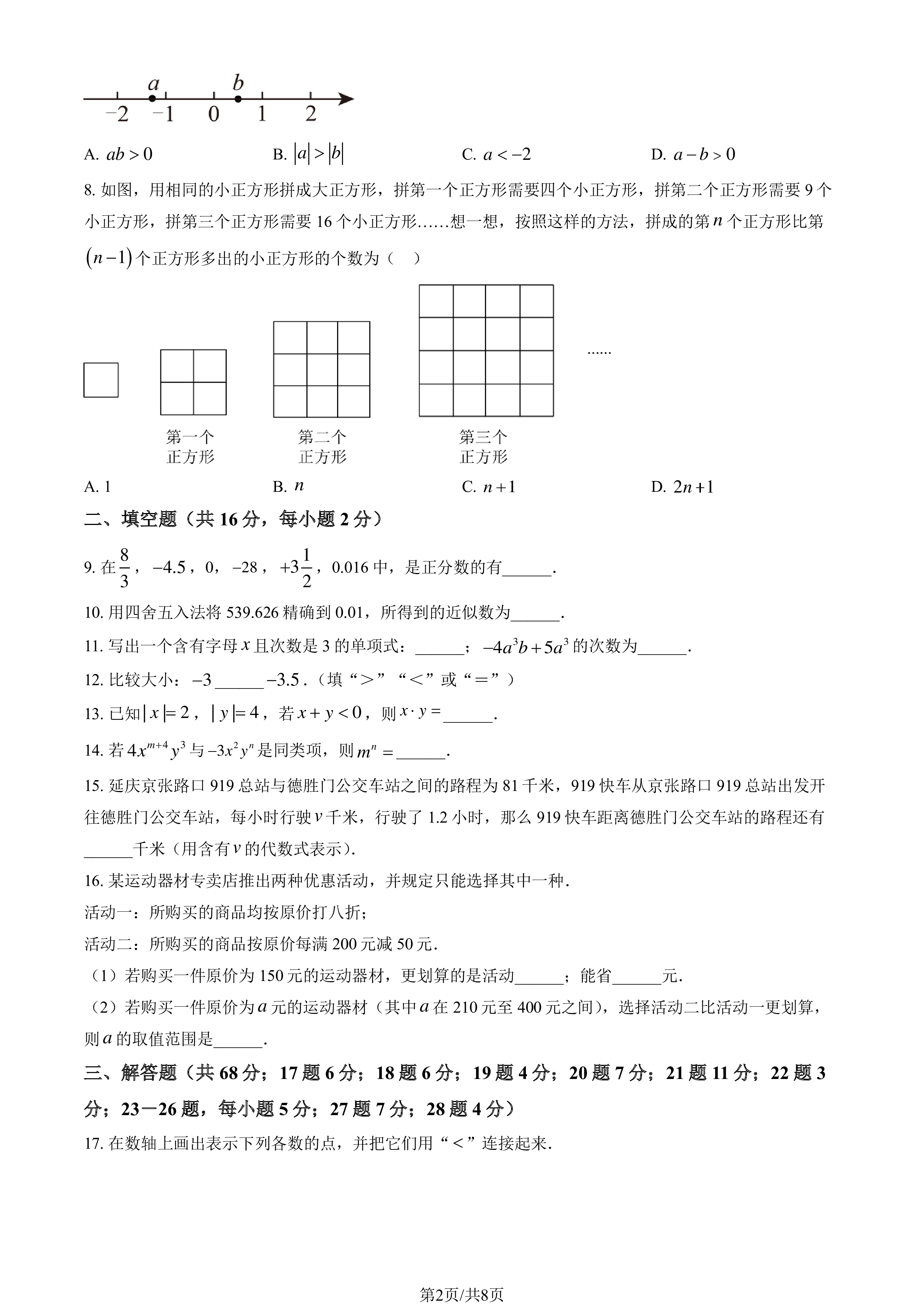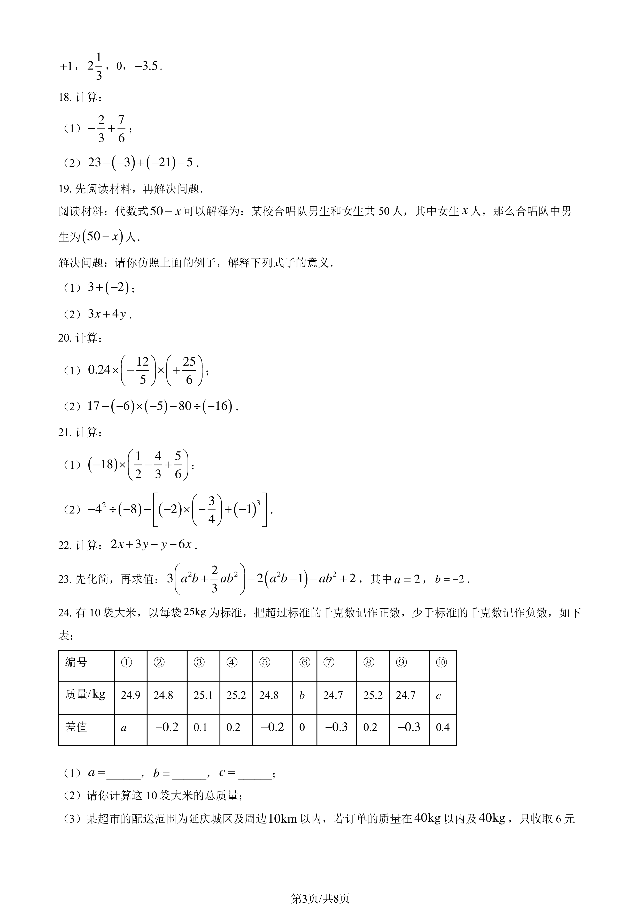 第1页/共8页2024北京延庆初一(上)期中数学考生须知1.本试卷共6页,共三道大题,28道小题,满分100分,考试时间120分钟.2.在试卷和答题卡上正确填写学校名称、姓名和考号.3.试题答案一律填涂或书写在答题卡上,在试卷上作答无效.4.在答题卡上,选择题、作图题用2B铅笔作答,其他试题用黑色签字笔作答.一、选择题:(共16分,每小题2分)第1-8题均有四个选项,符合题意的选项只有一个.1.中国古代数学著作《九章算术》的“方程”一章,第三题中明确提出了正负术.刘徽在该术的注文里实质上给出了正、负数的定义:“两算得失相反,要令‘正’、‘负’以名之”.译文是:今有两数若其意义相反,则分别叫做正...