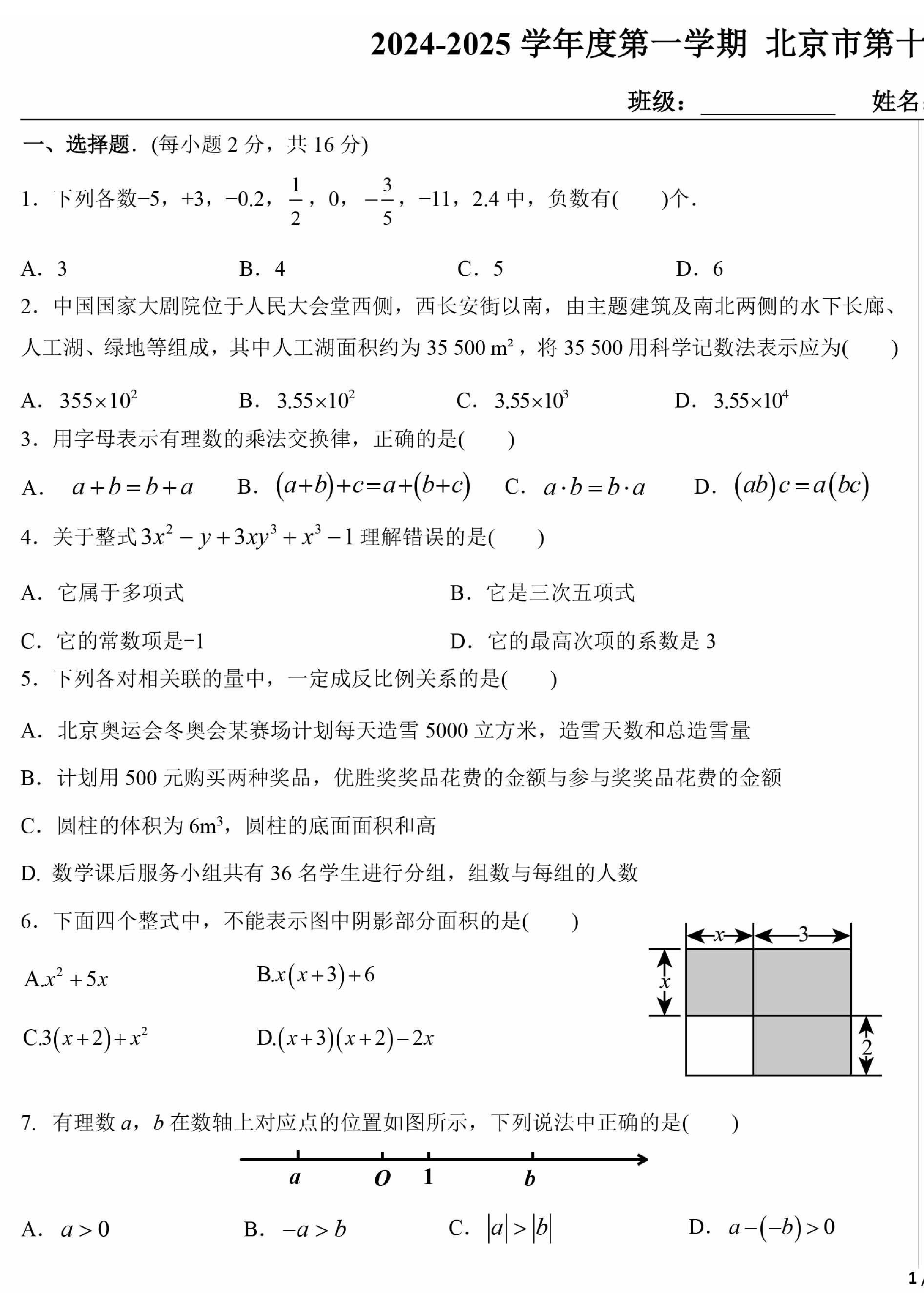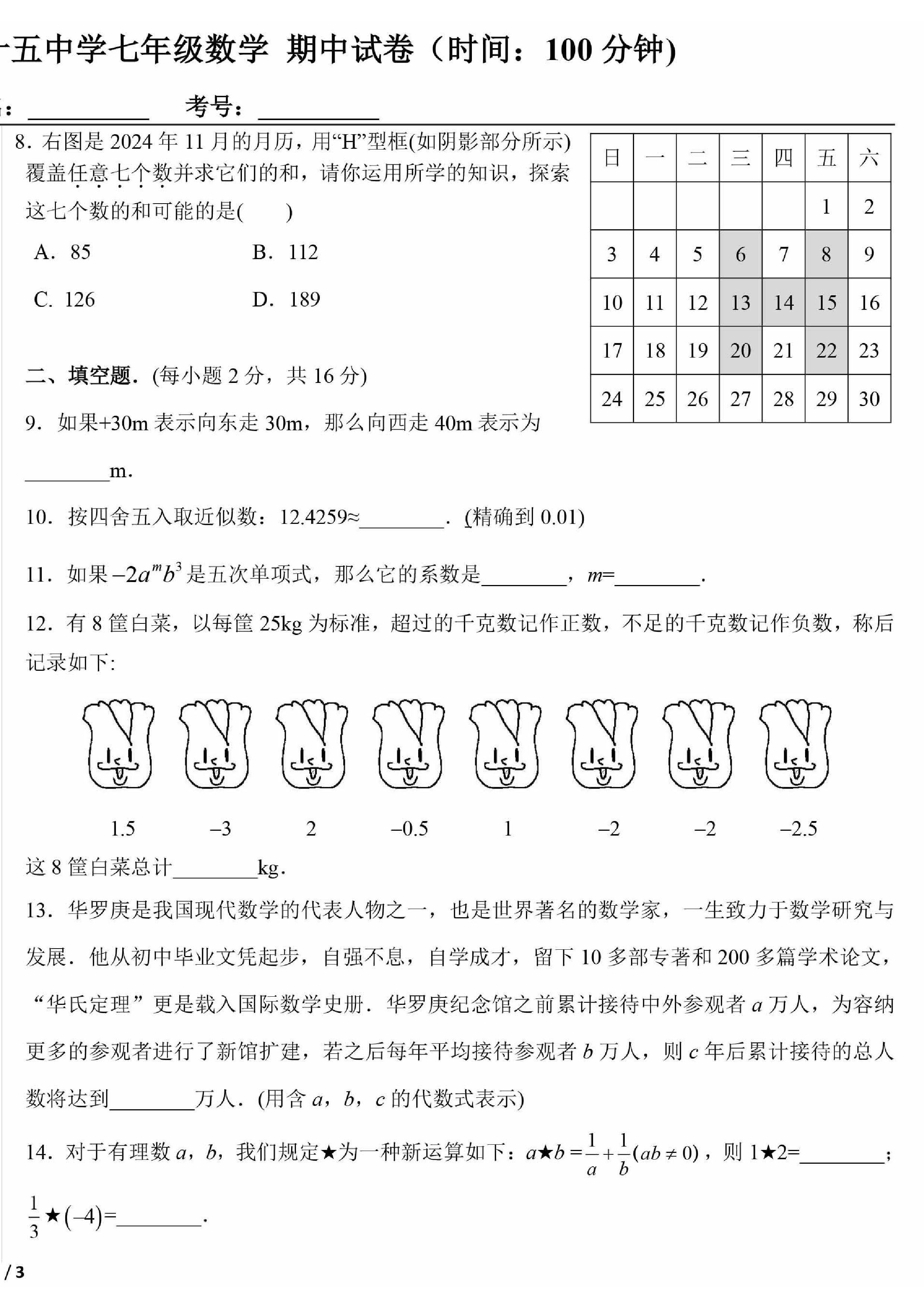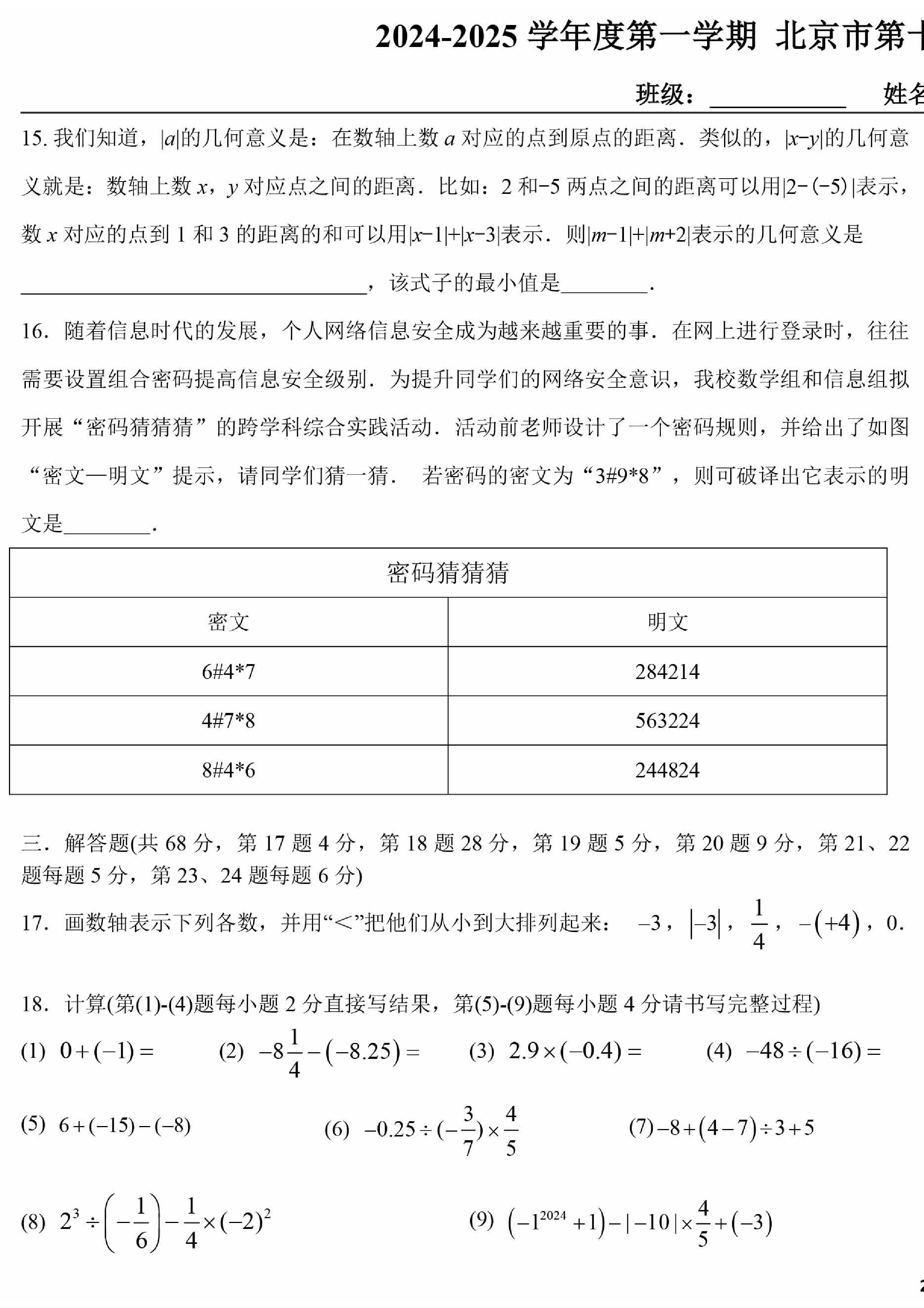 第1页(共4页)1.16北京市第十五中学2024—2025学年度第一学期期中试卷七年级数学答案及评分参考2024.11一、选择题(本题共16分,每小题2分)题号12345678答案BDCBCADC二、填空题(每小题2分,共16分)9101112-4012.43-2;2194.513141516abc32;324数m对应的点到1和5的距离的和;3722448三、解答题(共68分,第17题4分,第18题28分,第19题5分,第20题9分,第21、22题每题5分,第23、24题每题6分)17.图略·················································...