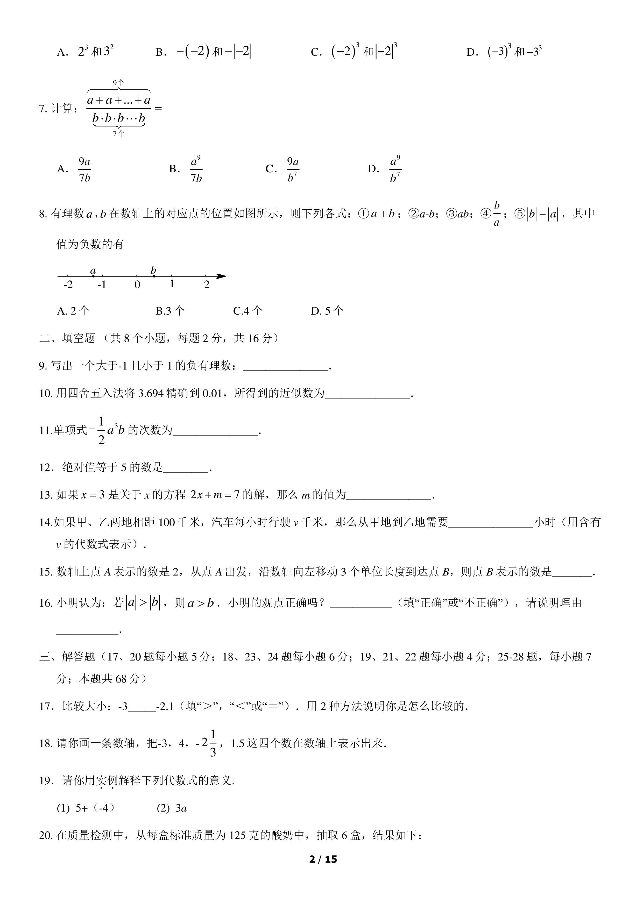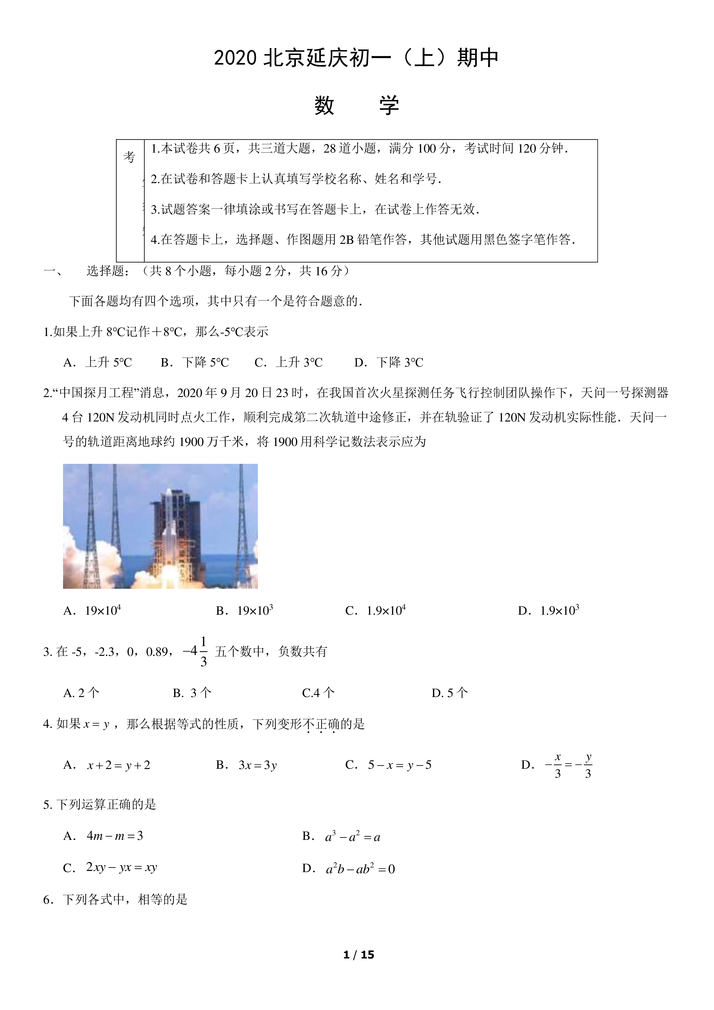 1/152020北京延庆初一(上)期中数学考生须知1.本试卷共6页,共三道大题,28道小题,满分100分,考试时间120分钟.2.在试卷和答题卡上认真填写学校名称、姓名和学号.3.试题答案一律填涂或书写在答题卡上,在试卷上作答无效.4.在答题卡上,选择题、作图题用2B铅笔作答,其他试题用黑色签字笔作答.一、选择题:(共8个小题,每小题2分,共16分)下面各题均有四个选项,其中只有一个是符合题意的.1.如果上升8℃记作+8℃,那么-5℃表示A.上升5℃B.下降5℃C.上升3℃D.下降3℃2.“中国探月工程”消息,2020年9月20日23时,在我国首次火星探测任务飞行控制团队操作下,天问一号探测器...