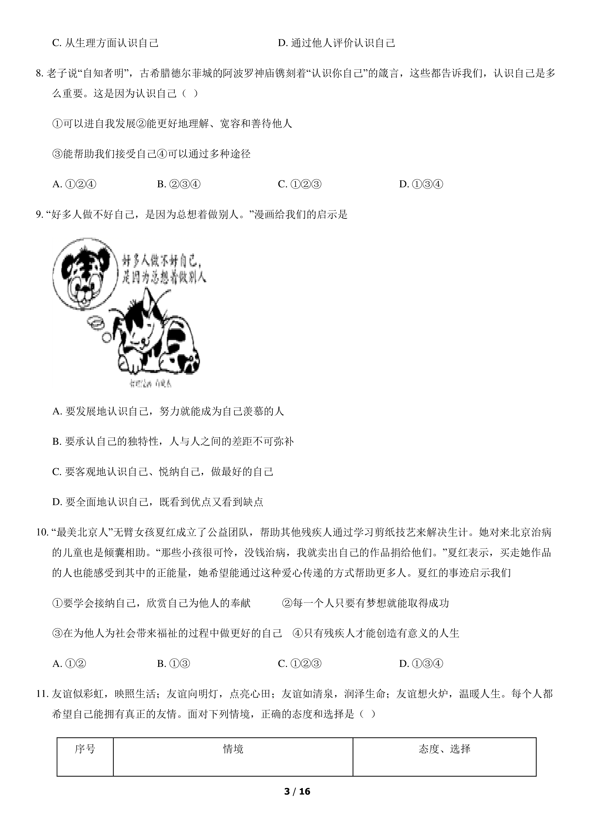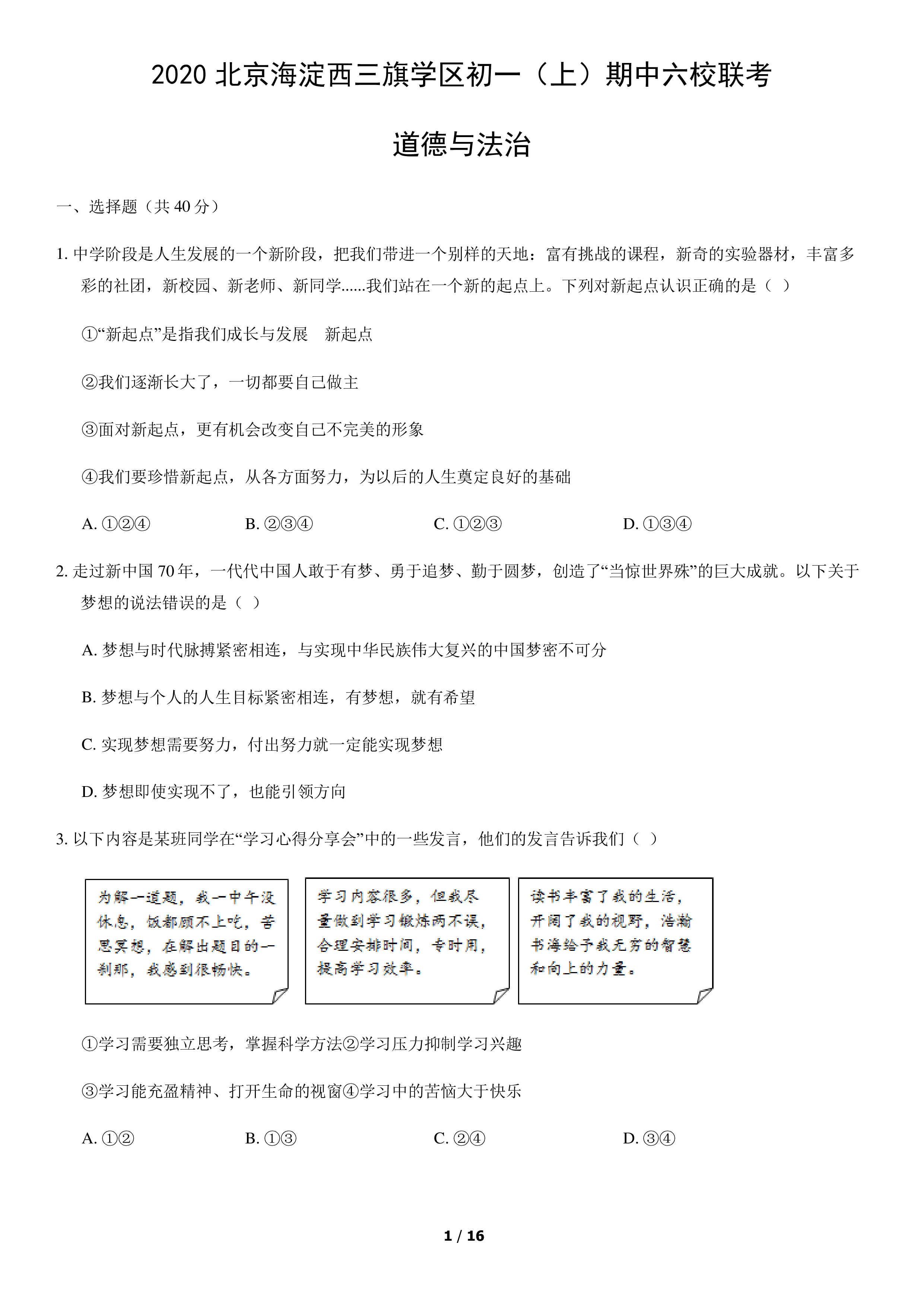 1/162020北京海淀西三旗学区初一(上)期中六校联考道德与法治一、选择题(共40分)1.中学阶段是人生发展的一个新阶段,把我们带进一个别样的天地:富有挑战的课程,新奇的实验器材,丰富多彩的社团,新校园、新老师、新同学......我们站在一个新的起点上。下列对新起点认识正确的是()①“新起点”是指我们成长与发展新起点②我们逐渐长大了,一切都要自己做主③面对新起点,更有机会改变自己不完美的形象④我们要珍惜新起点,从各方面努力,为以后的人生奠定良好的基础A.①②④B.②③④C.①②③D.①③④2.走过新中国70年,一代代中国人敢于有梦、勇于追梦、勤于圆梦,创造了“当惊世界殊”的巨大成就。以下关于...