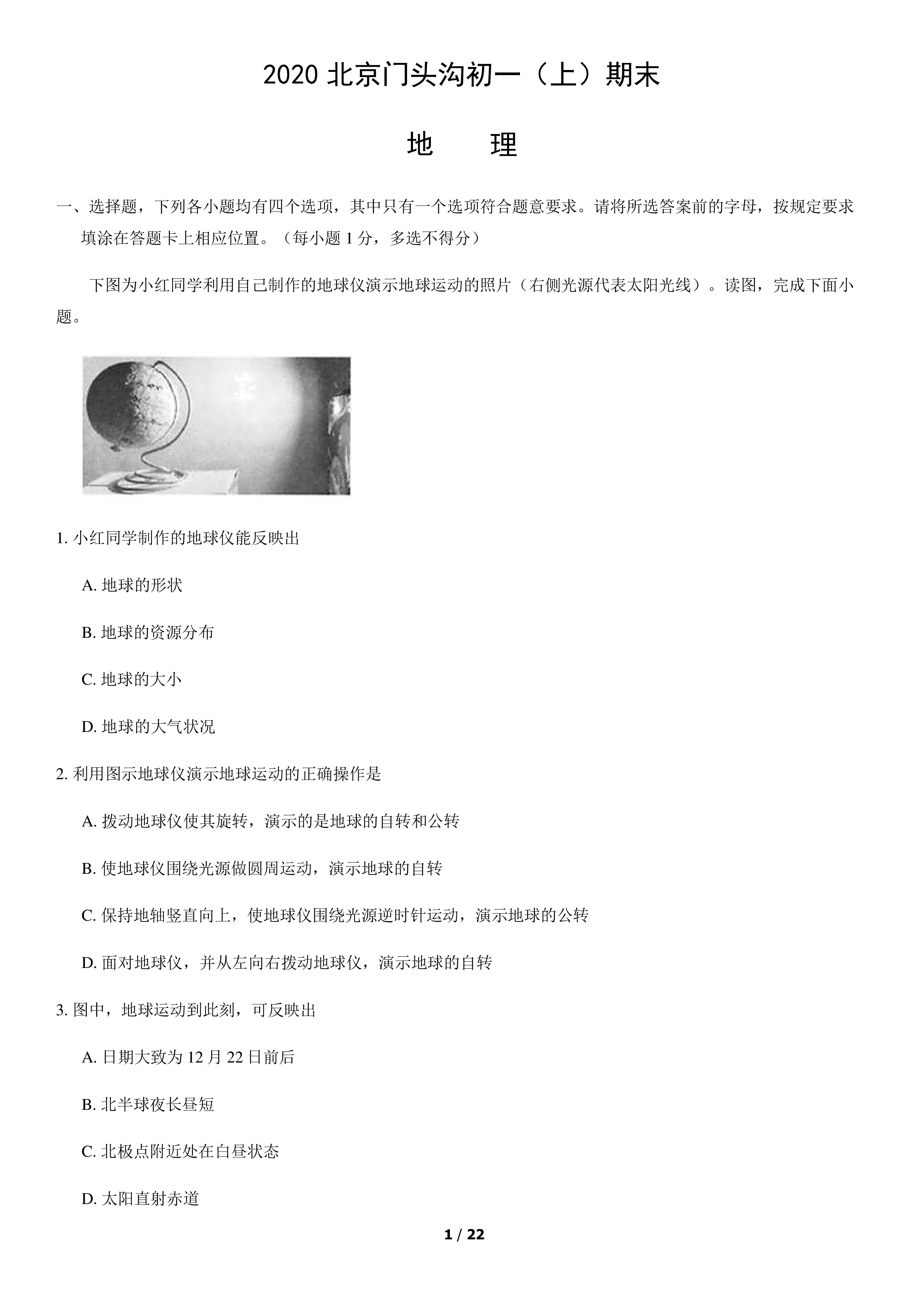 1/222020北京门头沟初一(上)期末地理一、选择题,下列各小题均有四个选项,其中只有一个选项符合题意要求。请将所选答案前的字母,按规定要求填涂在答题卡上相应位置。(每小题1分,多选不得分)下图为小红同学利用自己制作的地球仪演示地球运动的照片(右侧光源代表太阳光线)。读图,完成下面小题。1.小红同学制作的地球仪能反映出A.地球的形状B.地球的资源分布C.地球的大小D.地球的大气状况2.利用图示地球仪演示地球运动的正确操作是A.拨动地球仪使其旋转,演示的是地球的自转和公转B.使地球仪围绕光源做圆周运动,演示地球的自转C.保持地轴竖直向上,使地球仪围绕光源逆时针运动,演示地球的公转D.面对地球仪...