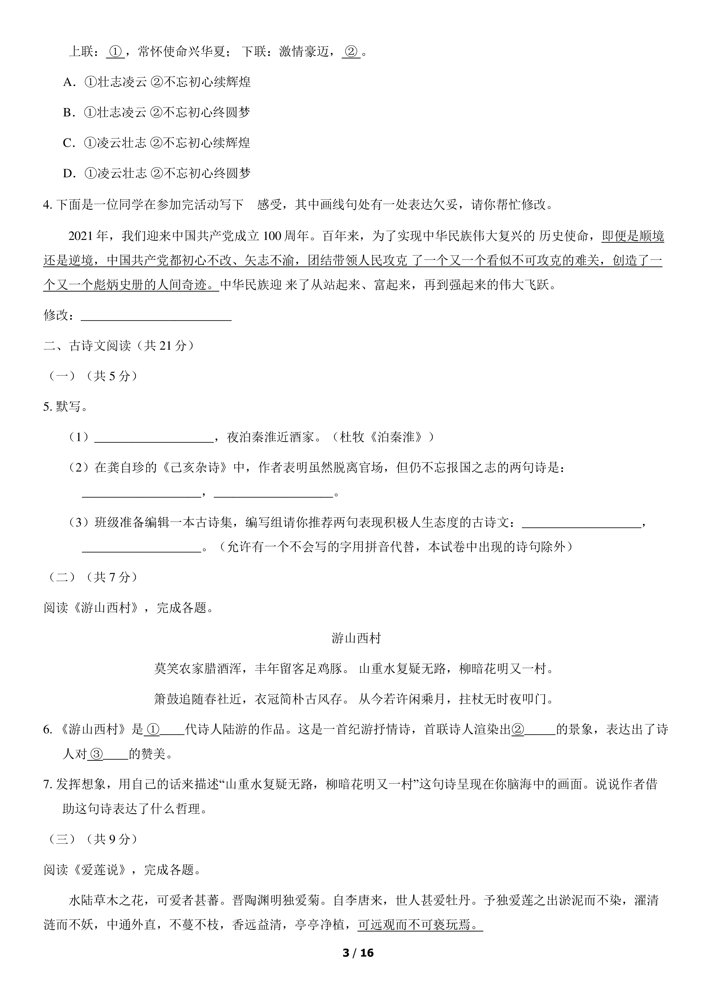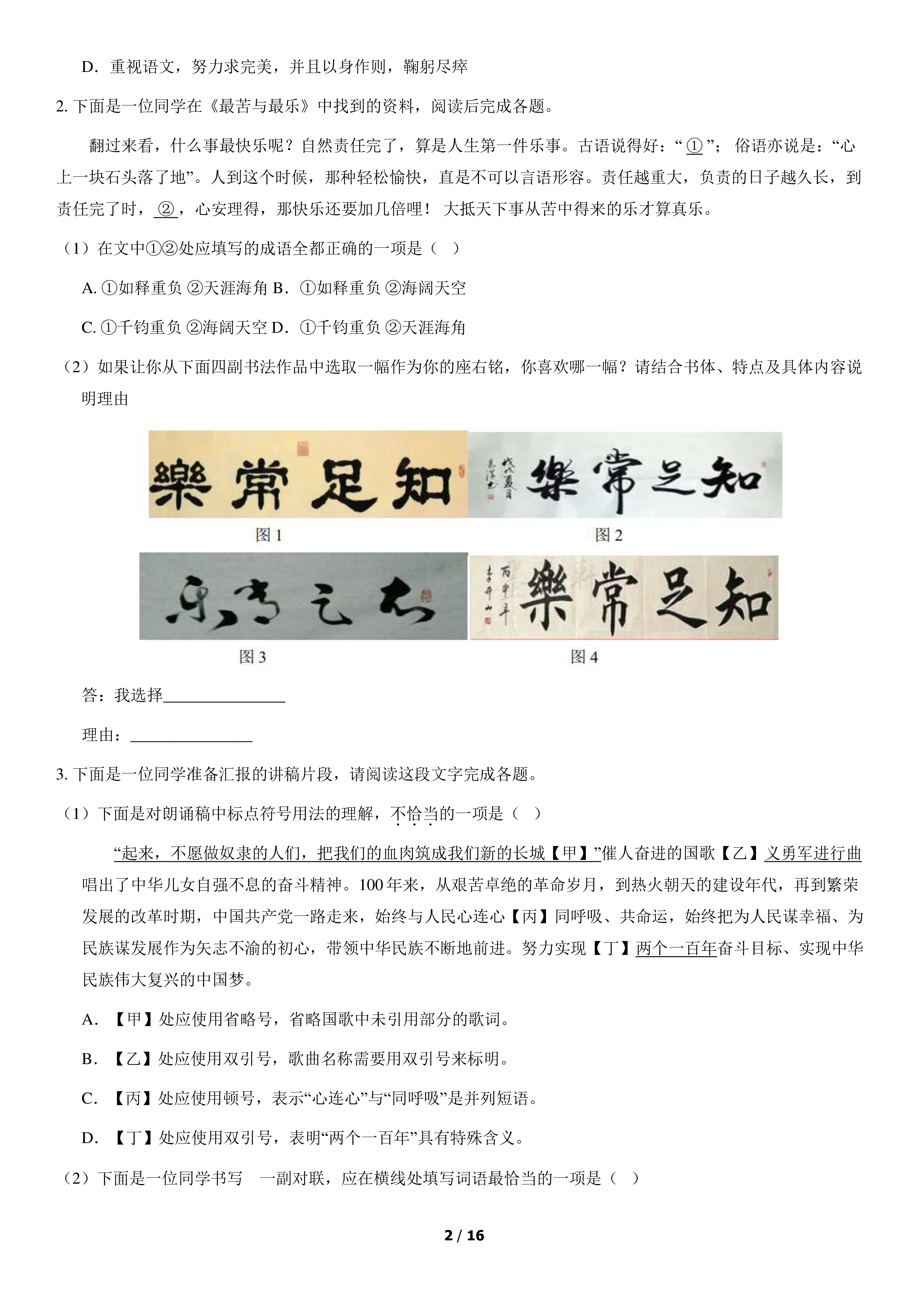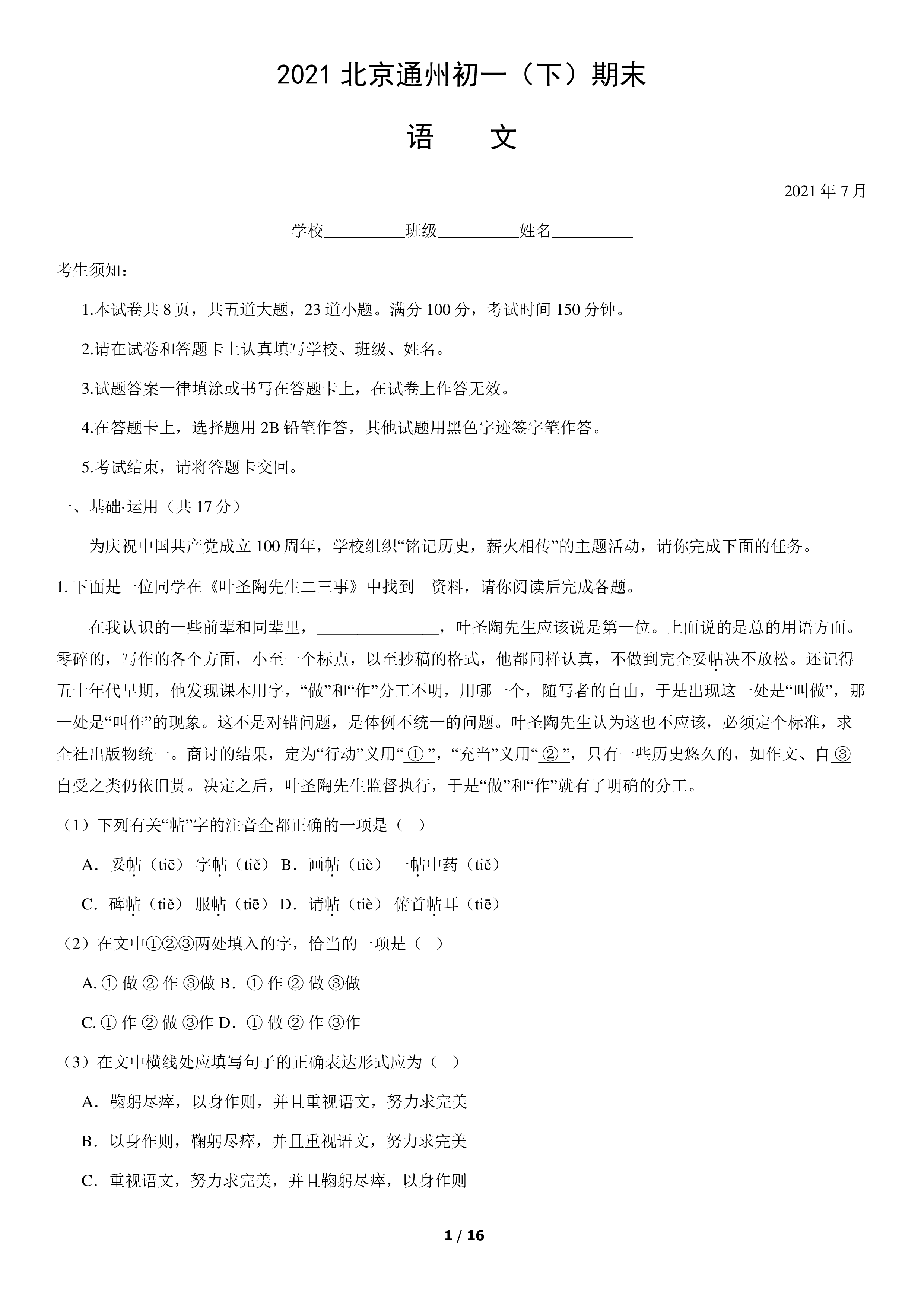 1/162021北京通州初一(下)期末语文2021年7月学校__________班级__________姓名__________考生须知:1.本试卷共8页,共五道大题,23道小题。满分100分,考试时间150分钟。2.请在试卷和答题卡上认真填写学校、班级、姓名。3.试题答案一律填涂或书写在答题卡上,在试卷上作答无效。4.在答题卡上,选择题用2B铅笔作答,其他试题用黑色字迹签字笔作答。5.考试结束,请将答题卡交回。一、基础·运用(共17分)为庆祝中国共产党成立100周年,学校组织“铭记历史,薪火相传”的主题活动,请你完成下面的任务。1.下面是一位同学在《叶圣陶先生二三事》中找到资料,请你阅读后完...