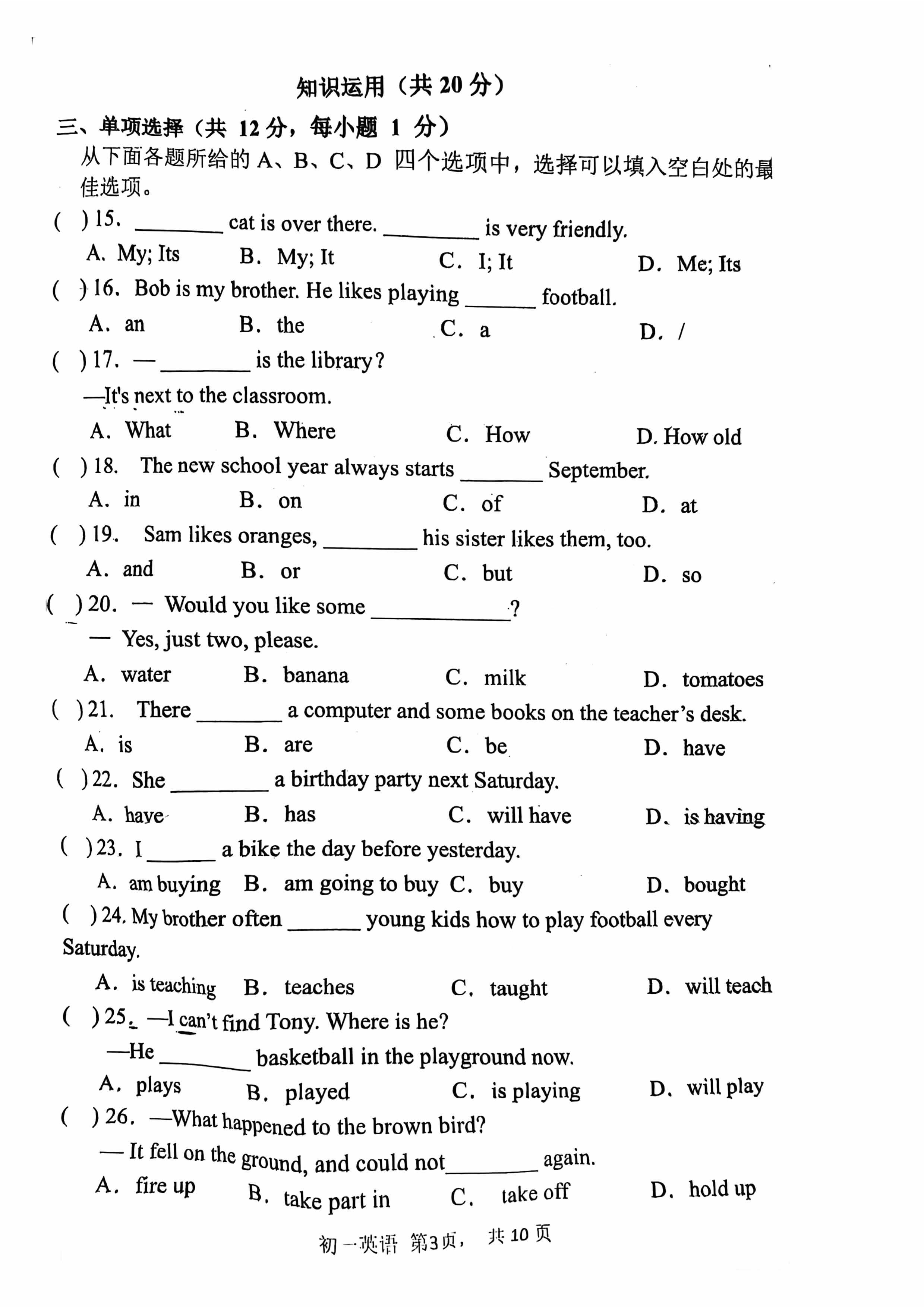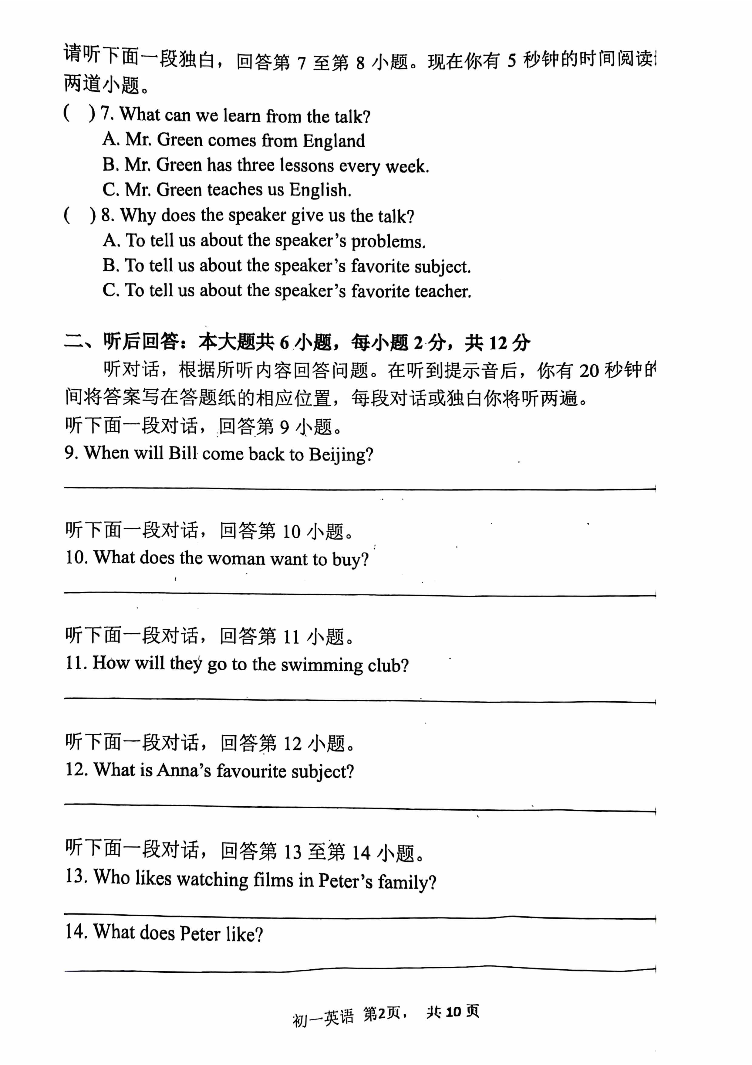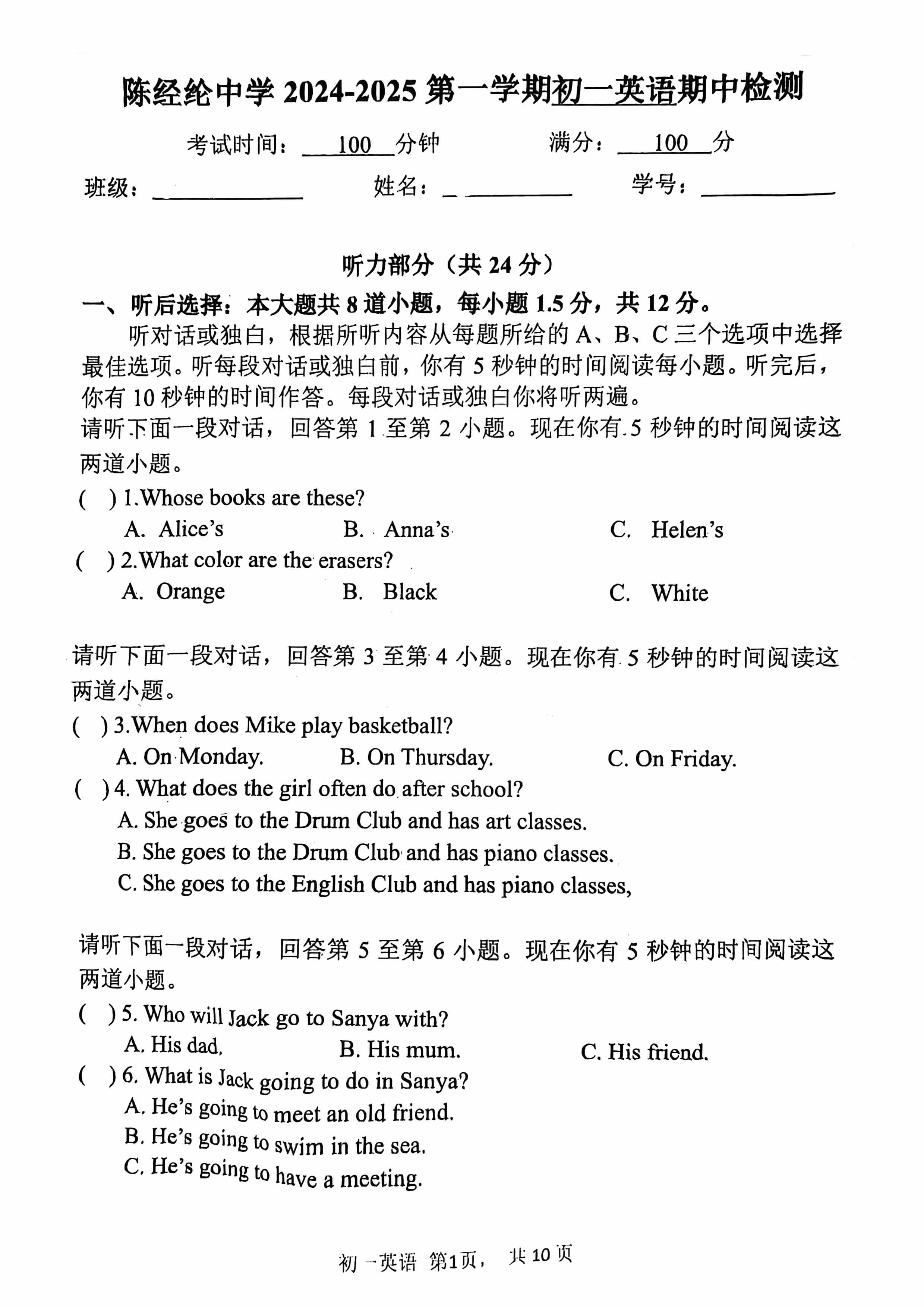 北京市陈经纶中学2024-2025学年上学期七年级期中测试英语试卷答案听力略四、单项选择15.A16.C17.B18.A19.A20.D21.A22.C23.C24.B25.C26.C五、完形填空27.D28.B29.B30.D31.B32.C33.B34.C六、阅读理解(一)匹配建议35.D36.A37.B(二)选择题38.B39.B40.C41.A42.B43.D44.D45.A46.C47.C六、阅读短文回答问题48.Inmostclasses,studentssitatdesksandlistentoteachers.49.inthenewclass,studentslearnabou...