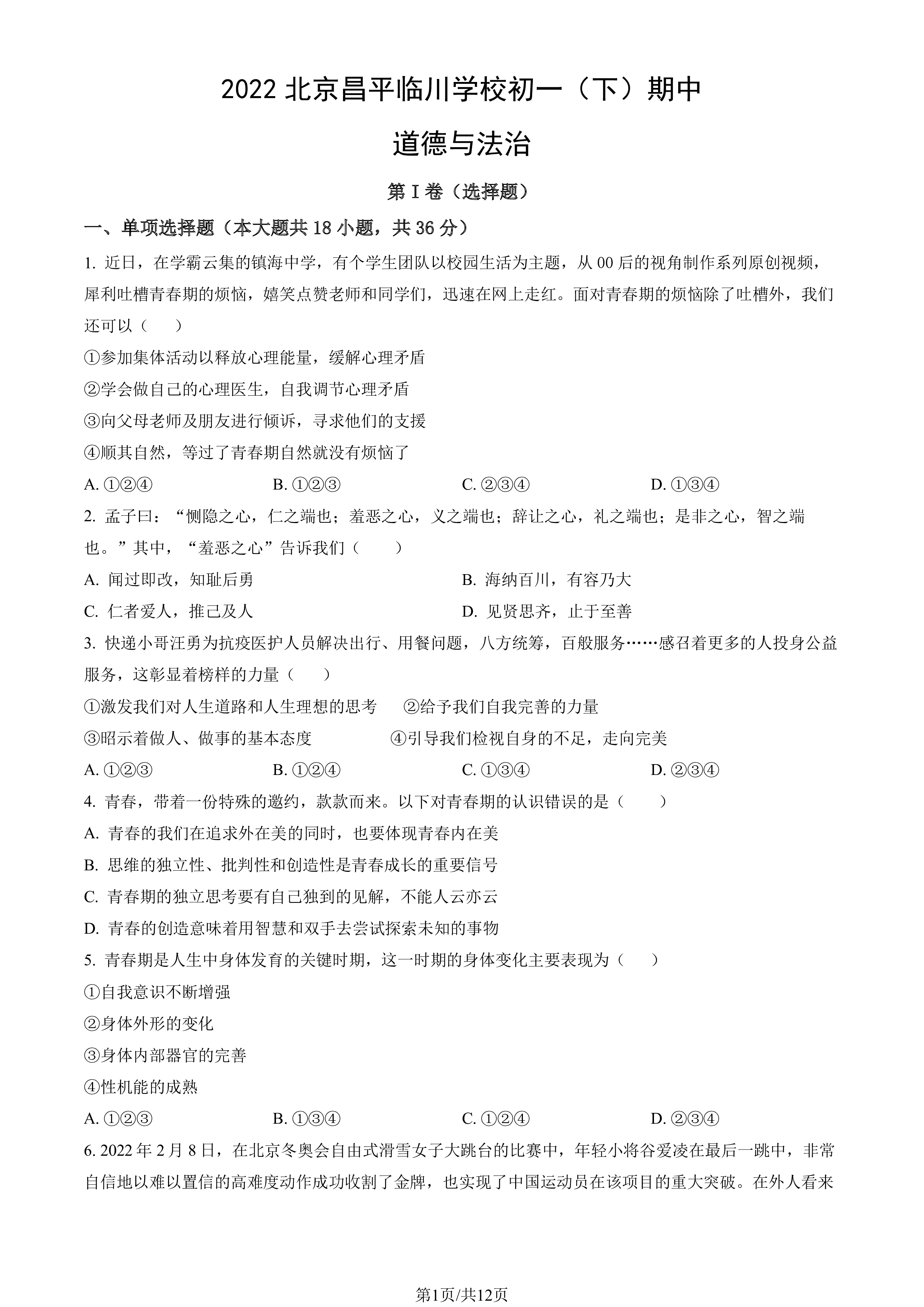 第1页/共12页学科网(北京)股份有限公司2022北京昌平临川学校初一(下)期中道德与法治第I卷(选择题)一、单项选择题(本大题共18小题,共36分)1.近日,在学霸云集的镇海中学,有个学生团队以校园生活为主题,从00后的视角制作系列原创视频,犀利吐槽青春期的烦恼,嬉笑点赞老师和同学们,迅速在网上走红。面对青春期的烦恼除了吐槽外,我们还可以()①参加集体活动以释放心理能量,缓解心理矛盾②学会做自己的心理医生,自我调节心理矛盾③向父母老师及朋友进行倾诉,寻求他们的支援④顺其自然,等过了青春期自然就没有烦恼了A.①②④B.①②③C.②③④D.①③④2.孟子曰:“恻隐之心,仁之端也;羞恶之心,义之端...