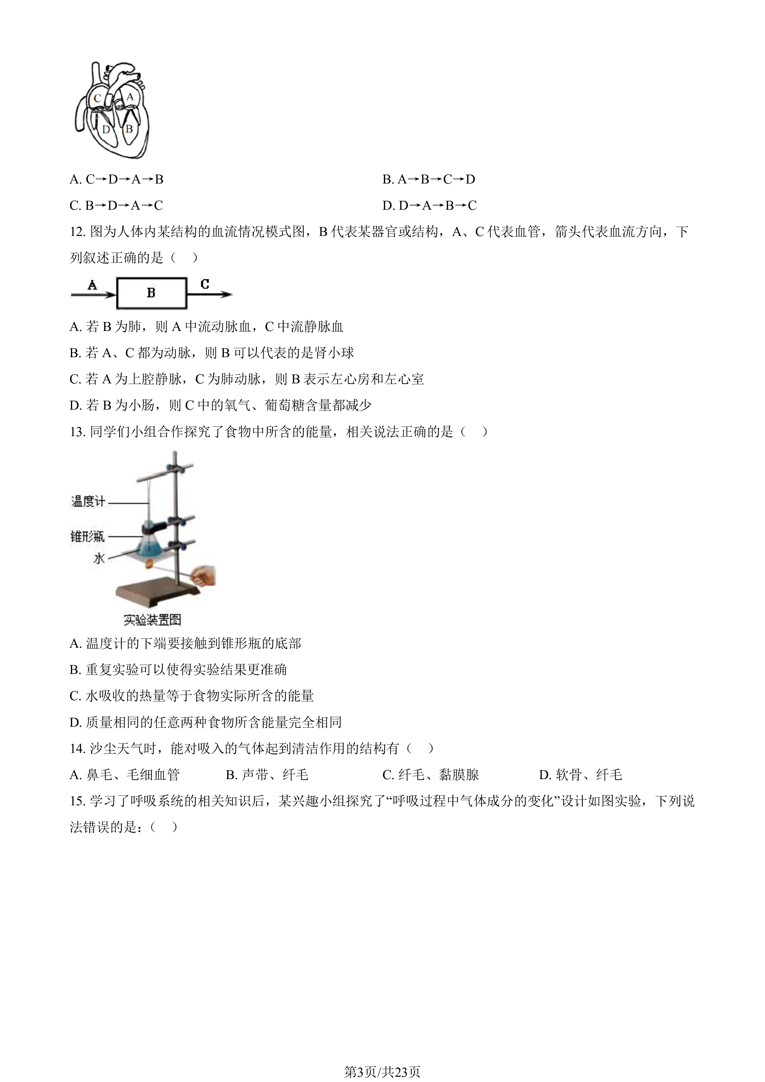第1页/共23页2023北京北师大实验中学初一(下)期中生物一、单项选择题1.下列关于人体营养物质的叙述,正确的是()A.水是人体重要的营养物质B.维生素是构成细胞的主要原料C.无机盐为生命活动提供能量D.蛋白质是人体内重要的备用能源物质2.在设计航天食品时,午餐包里已经准备了八宝米饭、酱香牛肉肠、五香鲽鱼、柠檬茶。根据均衡膳食原则,你认为还应增加的食物是A.黑米炒面B.花椰菜C.宫保鸡丁D.桃汁饮料3.图中甲图所示的是与小肠相通的消化腺,乙图所示的是小肠的结构特点,其中与其功能相适应的特点叙述错误的是()A.若图中A处阻塞,可能影响脂肪的消化B.小肠含3种消化液,利于食物的消化C.皱襞和绒毛...