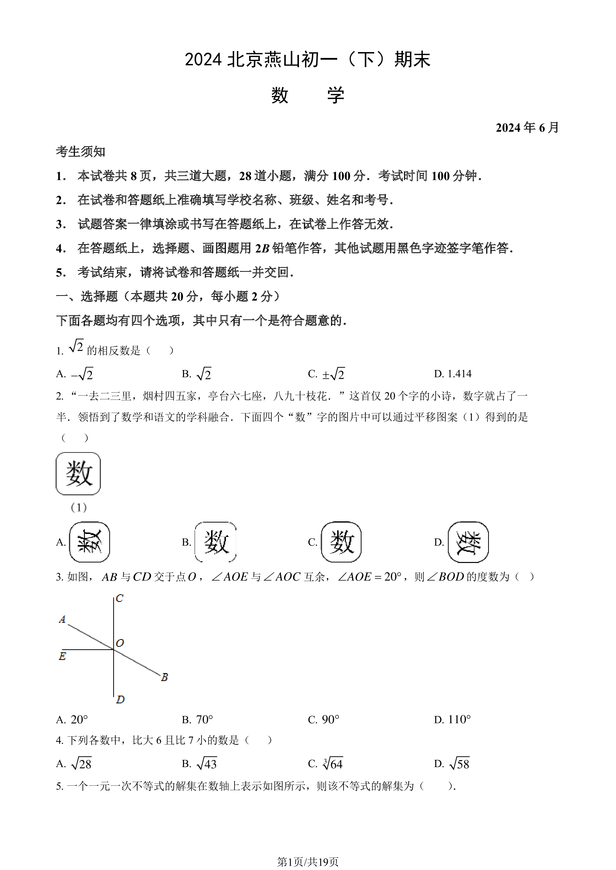 第1页/共19页2024北京燕山初一(下)期末数学2024年6月考生须知1.本试卷共8页,共三道大题,28道小题,满分100分.考试时间100分钟.2.在试卷和答题纸上准确填写学校名称、班级、姓名和考号.3.试题答案一律填涂或书写在答题纸上,在试卷上作答无效.4.在答题纸上,选择题、画图题用2B铅笔作答,其他试题用黑色字迹签字笔作答.5.考试结束,请将试卷和答题纸一并交回.一、选择题(本题共20分,每小题2分)下面各题均有四个选项,其中只有一个是符合题意的.1.的相反数是()A.B.C.D.1.4142.“一去二三里,烟村四五家,亭台六七座,八九十枝花.”这首仅20个字的小诗,数字就占了一半....