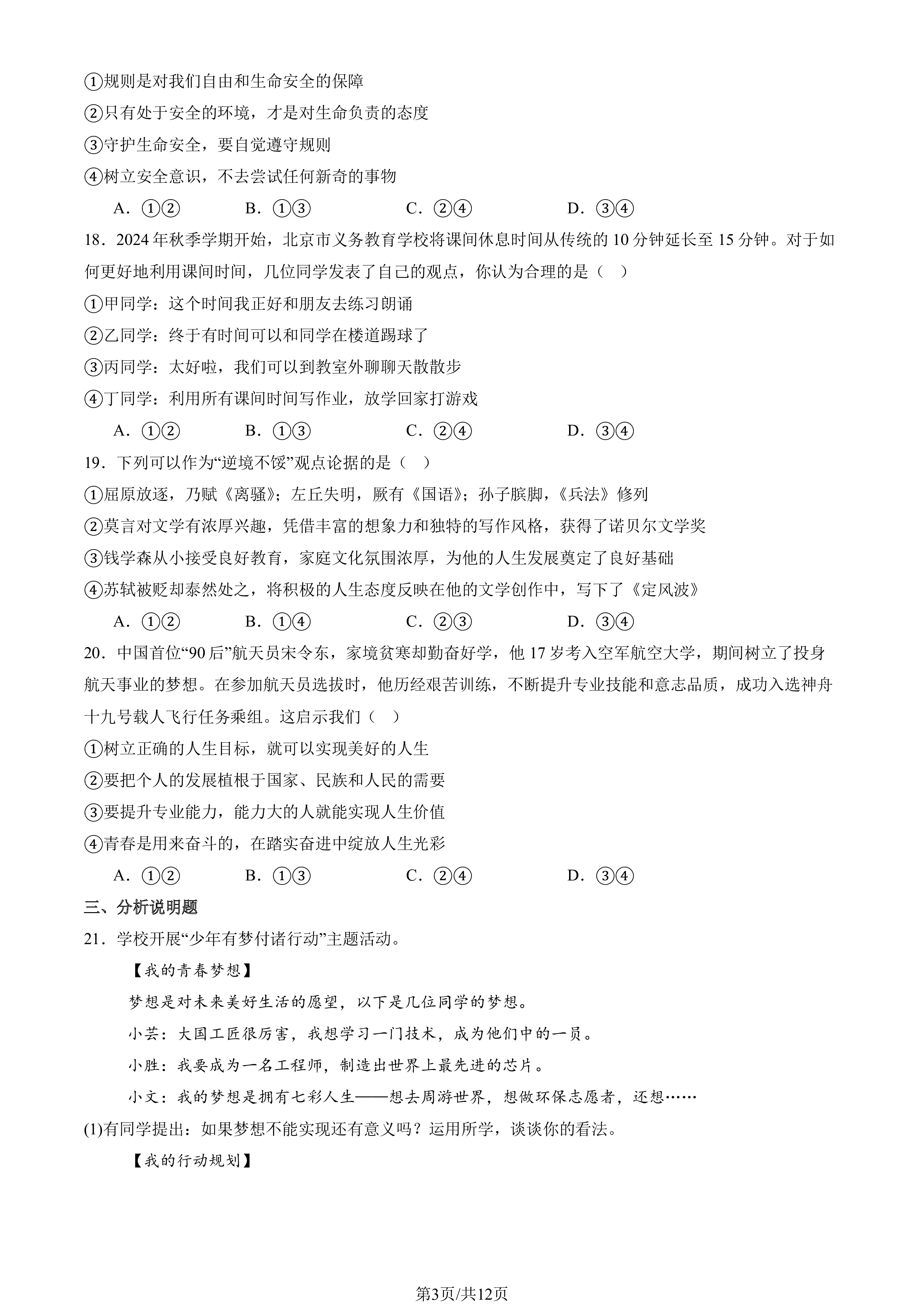 第1页/共12页2025北京朝阳初一(上)期末道德与法治一、判断题1.初中阶段,是人生美好的年华,也是规划未来之路的重要时期。()2.小明说话有口音,但他勇敢地去参加演讲比赛。这是接纳自己的表现。()3.他人的评价是我们认识自己的镜子,有助于形成对自己更为客观、完整、清晰的认识。()4.建设美好家庭,只是爸爸妈妈的责任,他们要赚钱养家,还要创造和谐的家庭氛围。()5.在学习和生活中,我们会遇到不同风格的老师,不管年龄、专业、性格等差异,他们都有值得我们学习的地方,值得我们尊重。()6.我和好友无话不谈,考试的时候,我有题不会,他悄悄告诉我答案。这就是真正的友谊。()7.我们班是优秀集体,班里的...