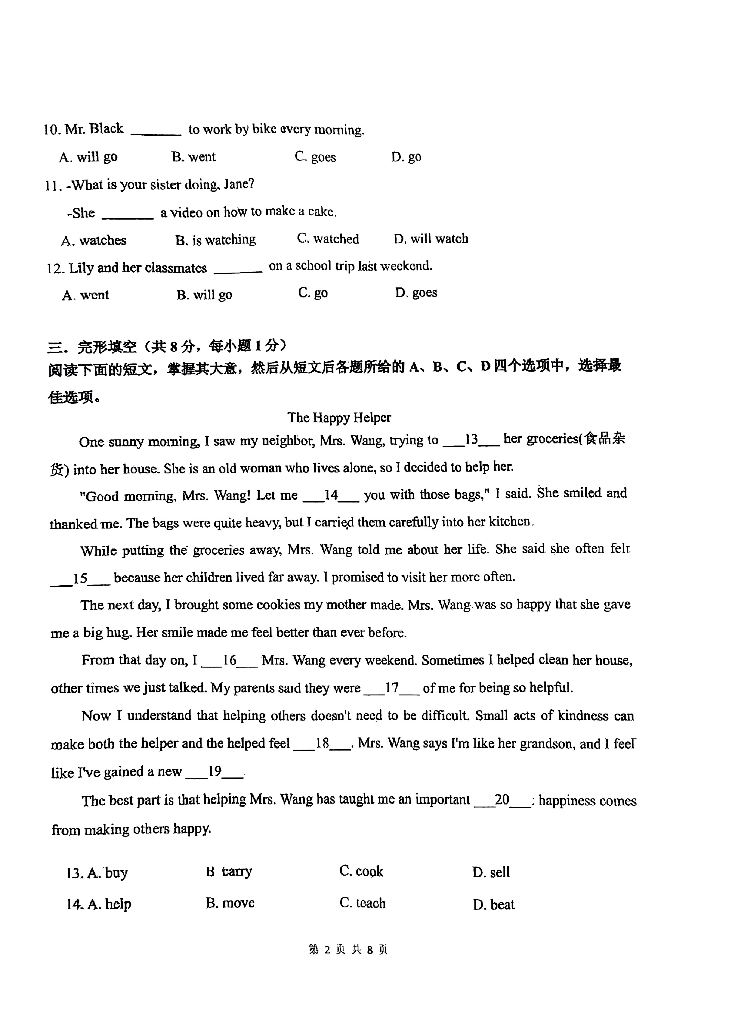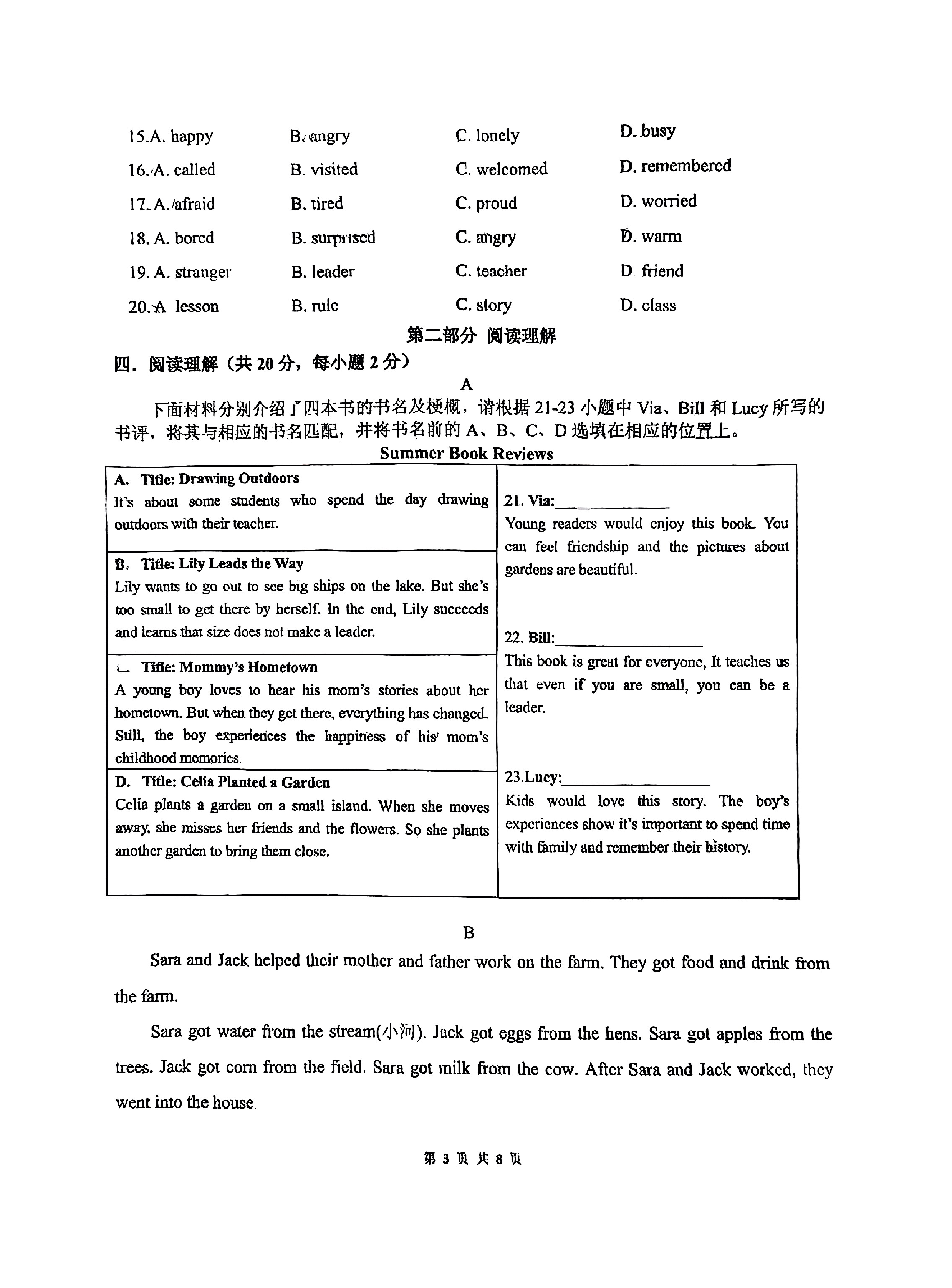 参考答案第一部分知识运用一、单项选择(发音不同)1.C2.D3.B4.A二、单项填空5.C6.D7.B8.A9.D10.C11.B12.A三、完形填空13.B14.A15.C16.B17.C18.D19.D20.A第二部分阅读理解A篇21.D22.B23.CB篇24.D25.A26.BC篇27.B28.B29.A30.B第三部分书面表达五、阅读表达:31.Onceamonth.32.Tobepatient.33.Inashopthatsellsoldclothes.34.Yes.(1)Volunteeringimprovescommunicationskills.(2)Itteachespat...